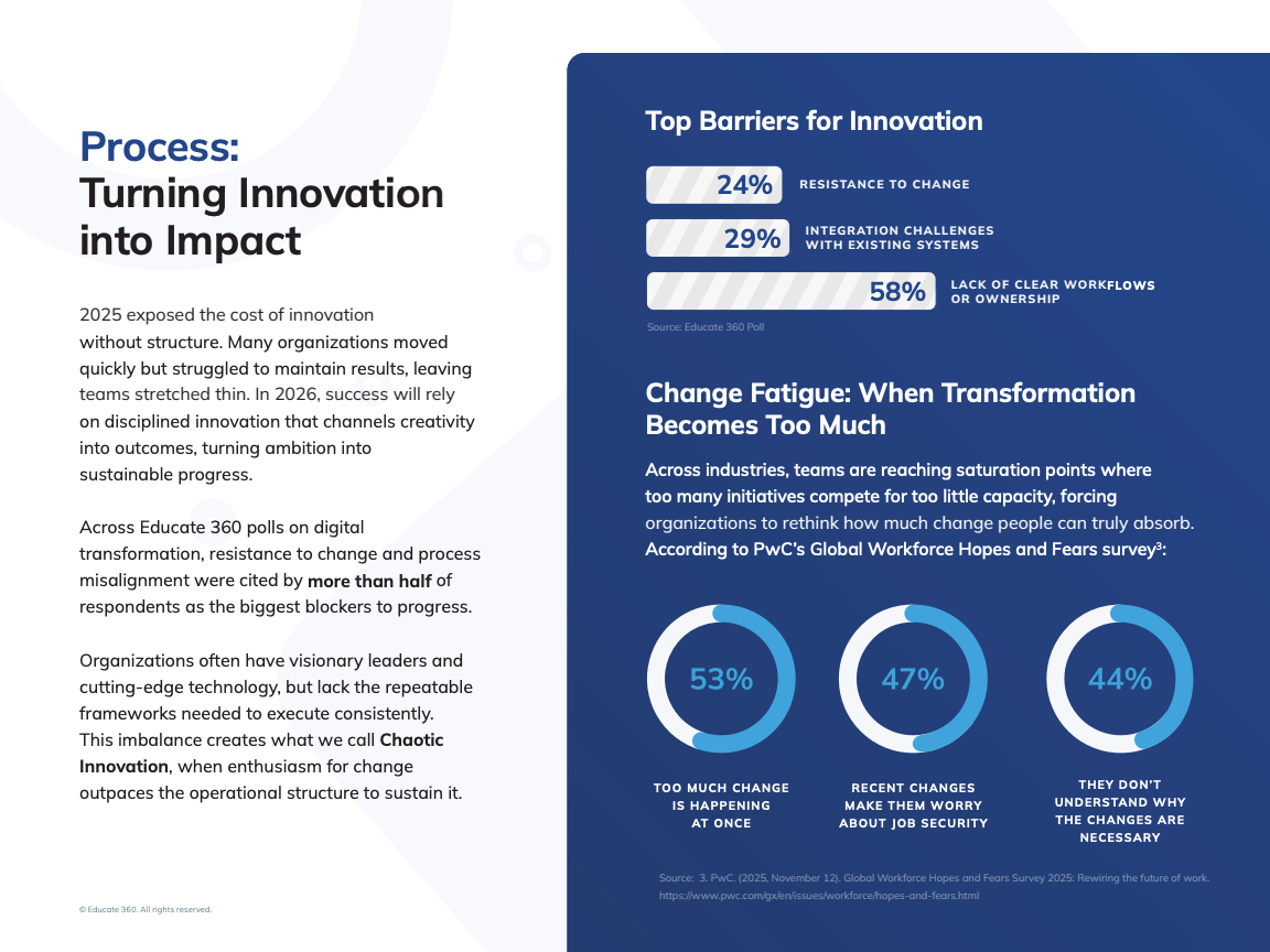 流程层面的挑战同样突出。超过一半的受访者将流程不清晰和变革疲劳视为创新受阻的关键因素,58%指出缺乏明确流程或责任归属,29%遭遇系统集成摩擦。PwC调研显示,员工普遍感到变革过于密集,并对岗位安全和变革必要性存在疑虑。结果是项目过多但产出有限,技术投入被消耗在返工和延迟中。报告强调,通过容量导向的项目排序、RACI责任框架以及以结果为导向的指标体系,才能将“混乱式创新”转化为可持续执行力。