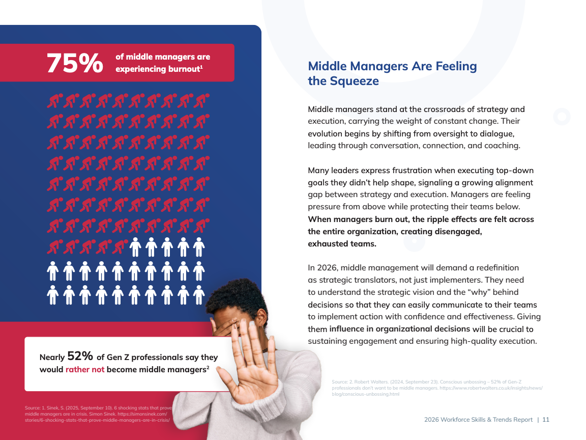 在领导力与组织层面,混合办公已成为常态,44%的员工偏好远程工作,28%偏好混合模式,重返全职办公室的意愿不足一成。与此同时,75%的中层管理者出现倦怠,近52%的Z世代明确不愿担任中层角色,暴露出战略与执行之间的承压断层。领导角色正在从控制者转向教练和连接者,情绪智力、沟通透明度与赋权能力成为关键生产要素。