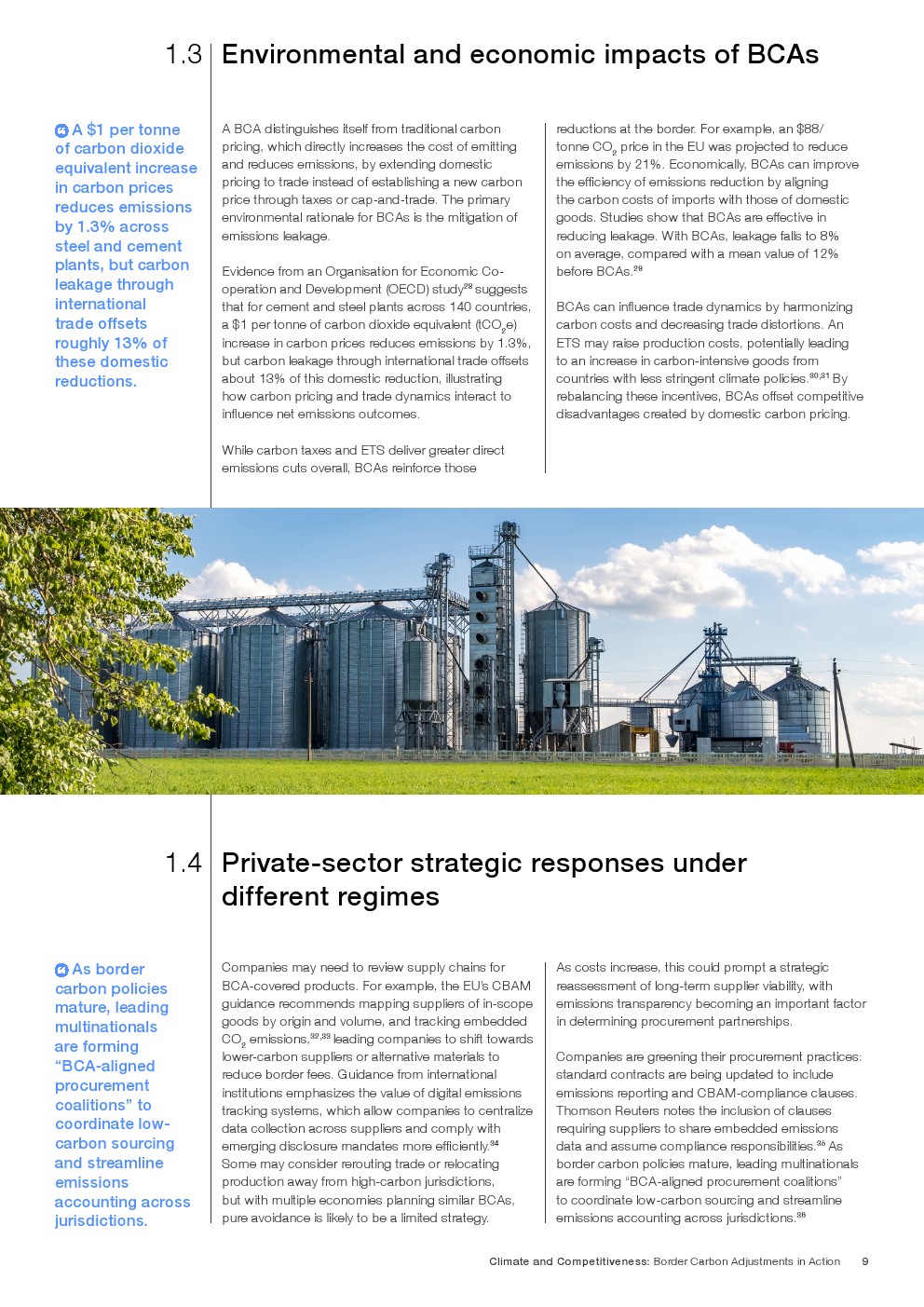 欧盟碳边境调节机制将于2026年全面实施,结束过渡期报告阶段,并同步逐步取消欧盟本土免费配额 。其设计以欧盟排放交易体系价格为基准,要求进口商按嵌入排放购买证书。经合组织研究显示,碳价每提高1美元/吨,可使钢铁与水泥行业减排1.3%,但约13%的减排效果会被碳泄漏抵消;引入边境调节后,泄漏率可由12%降至8% 。这表明边境机制在修正贸易扭曲方面具有边际效率。