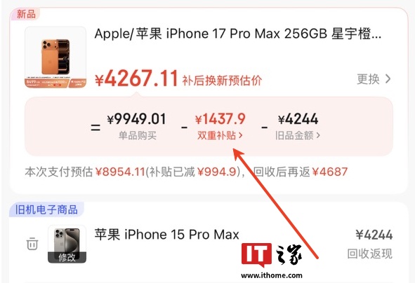 iPhone 17 Pro Max 上市价 9999 元,今日京东以旧换新补贴 994.9~1500(旧机无限制,但回收价格需超百元达回收门槛),8499 元起即可入手。