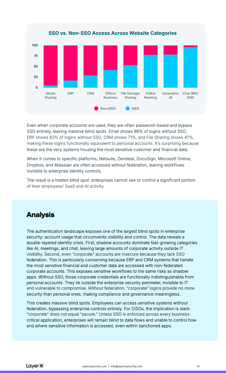 身份治理的失效进一步加剧了这一风险。数据显示,67%的生成式AI访问、64%的在线会议登录以及77%的CRM访问,均通过个人或非托管账号完成。即便使用企业账号,SSO的覆盖率仍然极低,ERP系统中83%的登录未启用SSO,CRM也高达71%。这意味着大量“企业系统”的访问行为,在安全强度上与个人账号并无本质差异,企业对核心业务数据的可视性和控制力被严重削弱。