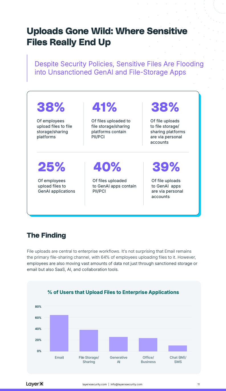 高速普及的另一面,是敏感数据暴露风险的同步放大。报告指出,40%的文件上传至生成式AI工具的内容包含PII或PCI数据,文件存储平台中的这一比例为41%。换言之,几乎每两次上传,就有一次涉及高度敏感信息。这些上传行为中,约四成发生在非企业账号之下,使得大量关键数据在未经审计和留痕的情况下进入外部平台,合规与泄露风险被系统性放大。