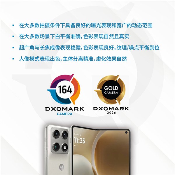 快科技3月3日消息,DXOMARK公布了摩托罗拉首款大折叠屏手机moto razr fold的相机评测结果,该机以164分的综合得分位列全球排名第8。