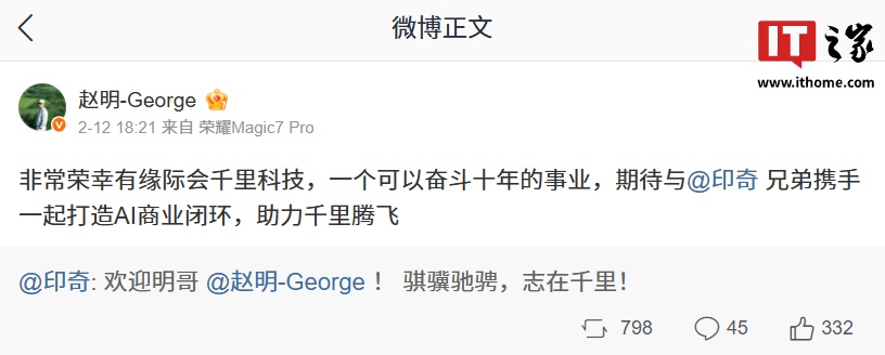 据IT之家此前报道,今年 2 月 12 日,赵明在微博发文宣布:非常荣幸有缘际会千里科技,一个可以奋斗十年的事业,期待与 @印奇 兄弟携手一起打造 AI 商业闭环,助力千里腾飞。千里科技董事长、阶跃星辰董事长印奇发文对赵明入职表示欢迎:“骐骥驰骋,志在千里!”