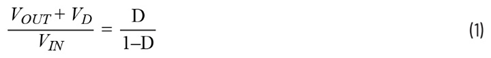 单端初级电感转换器拓扑结构允许输入高于、等于或低于目标输出电压(图1)。公式1显示了连续导通模式(CCM)下转换率与占空比的函数关系。