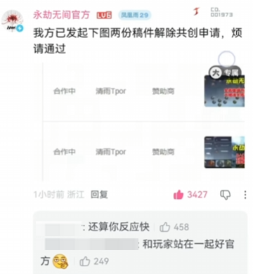 随着舆论的进一步发酵,包括一些头部游戏主播也跟着提及并探讨此事,一些此前与清雨有过合作的游戏(如网易《永劫无间》)、店铺等,也纷纷宣布与其终止合作。