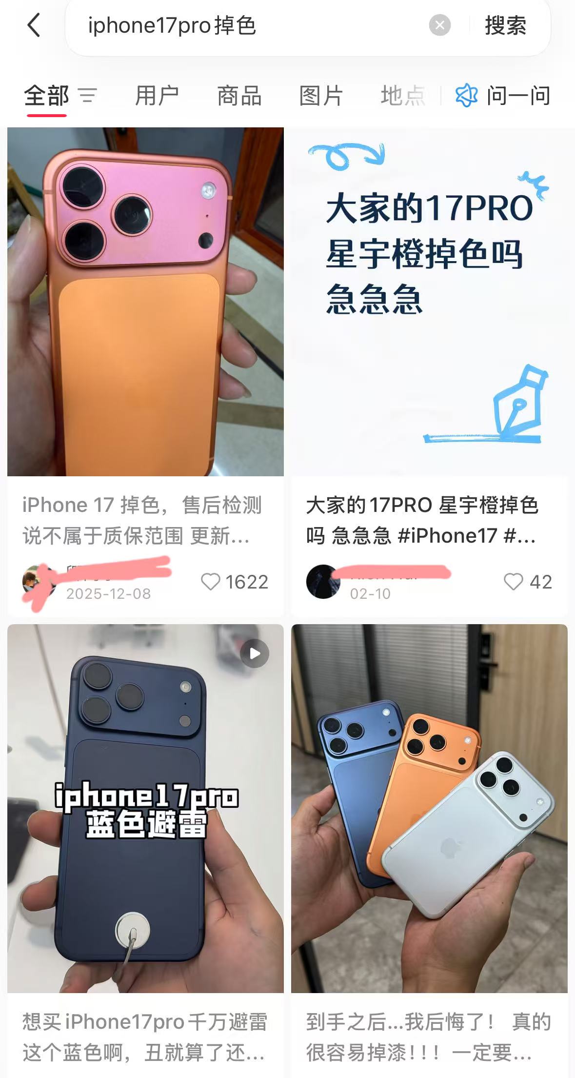 界面新闻记者查询社交平台发现,iPhone 17 Pro系列掉色问题从去年9月开始就有人发帖反映,橙色的较多,有人称蓝色也出现掉色情况。