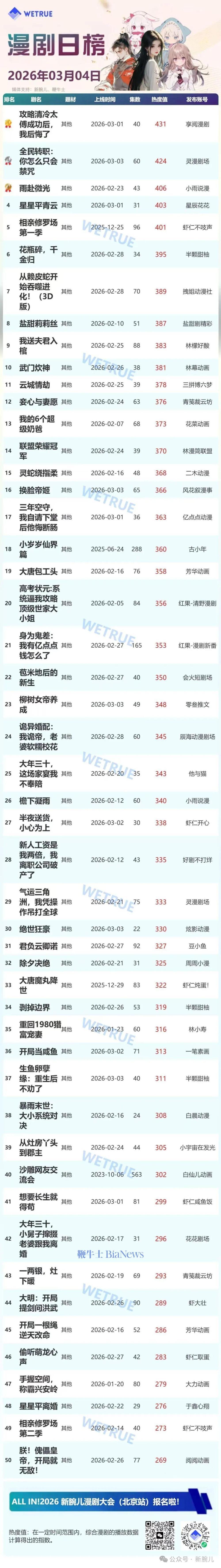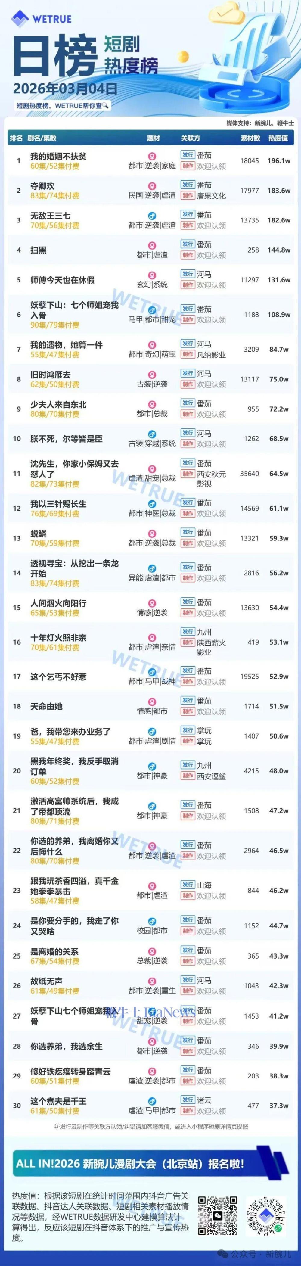 今天发布的是昨天(3月4日)漫剧及短剧付费大盘日榜。