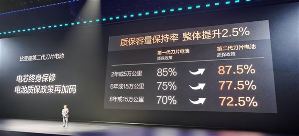 值得注意的是,王传福还宣布比亚迪第二代刀片电池质保政策升级,质保容量保持率同比提升2.5%。