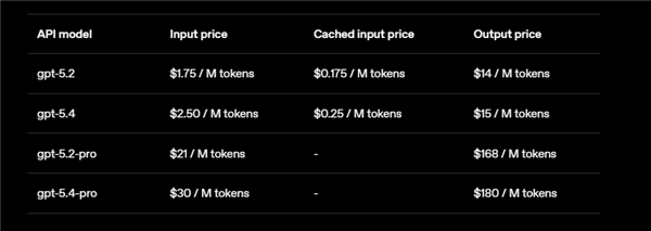 至于更高性能的GPT-5.4 Pro,每百万输入token价格为30美元,输出token价格为180美元。