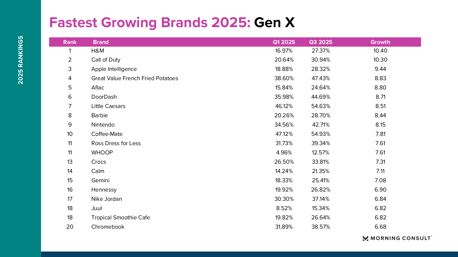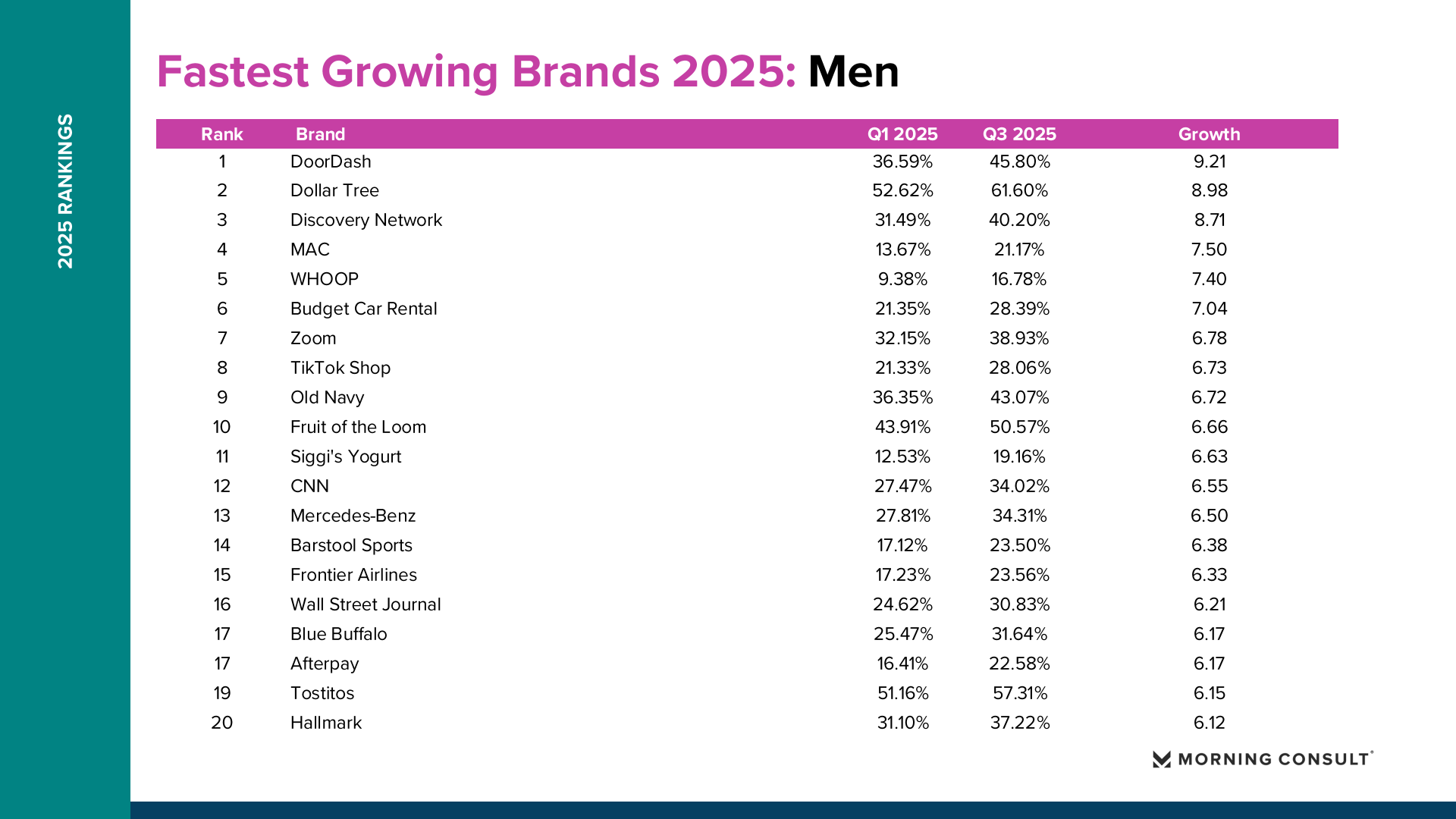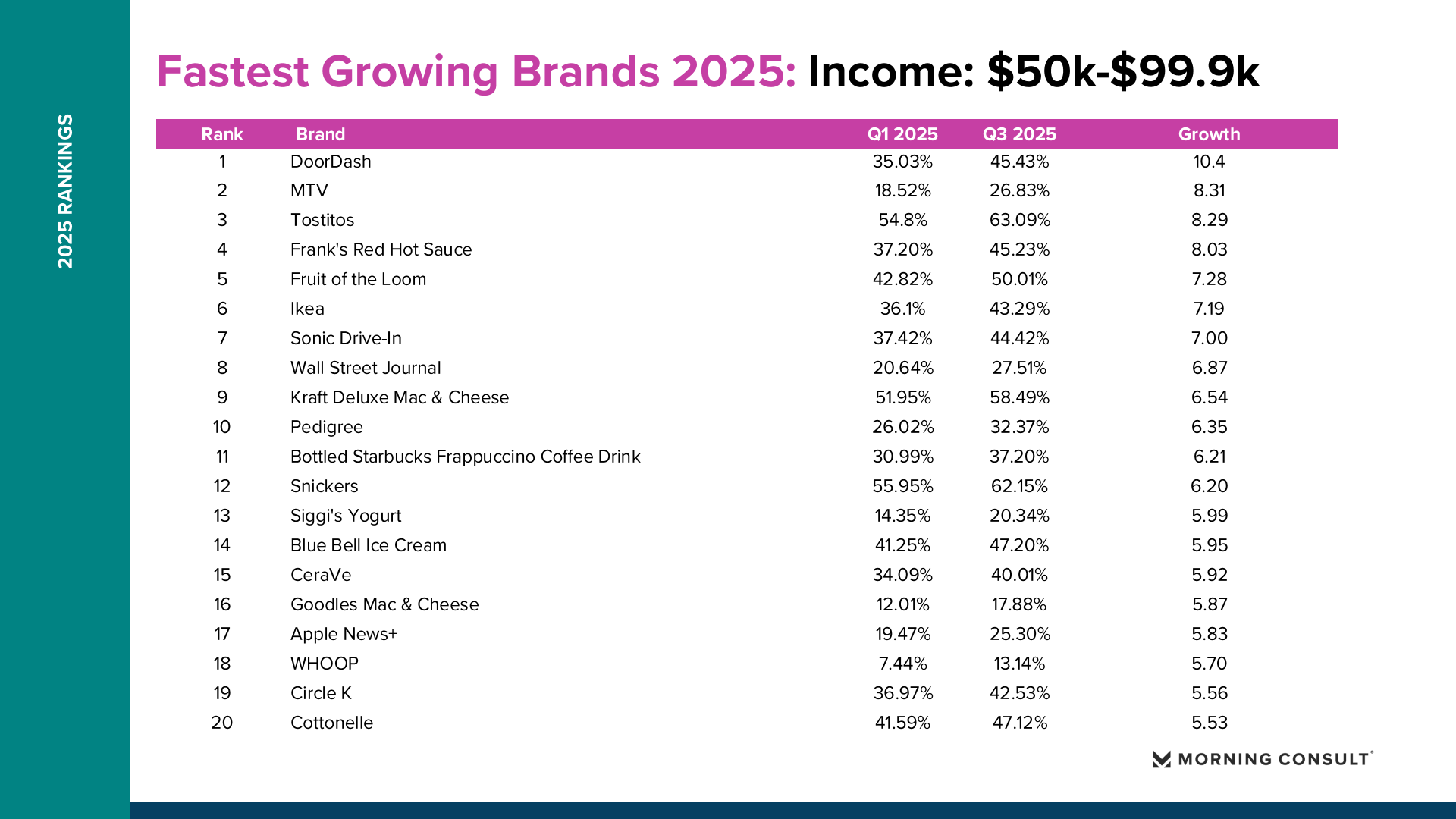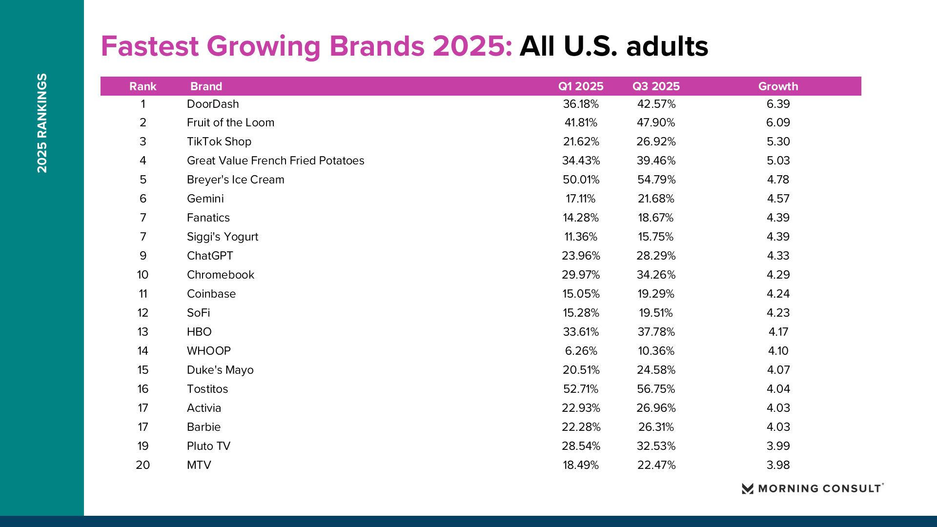 2025年美国品牌增长整体呈现“总量趋稳、结构分化”的特征。Morning Consult数据显示,纳入统计的品牌平均购买考虑度仅增长0.73个百分点,说明消费者整体品牌偏好变化有限,但部分品牌在特定消费趋势推动下实现显著突破。 在所有美国成年人样本中,DoorDash购买考虑度从2025年第一季度的36.18%提升至第三季度的42.57%,增长6.39个百分点,成为年度增长最快品牌。Fruit of the Loom从41.81%升至47.90%,增长6.09个百分点。TikTok Shop从21.62%提升至26.92%,增长5.30个百分点。Breyer’s Ice Cream购买考虑度达到54.79%,增长4.78个百分点。这些品牌的共同特点是高度贴近日常消费场景,并通过渠道创新或价格优势扩大用户基础。