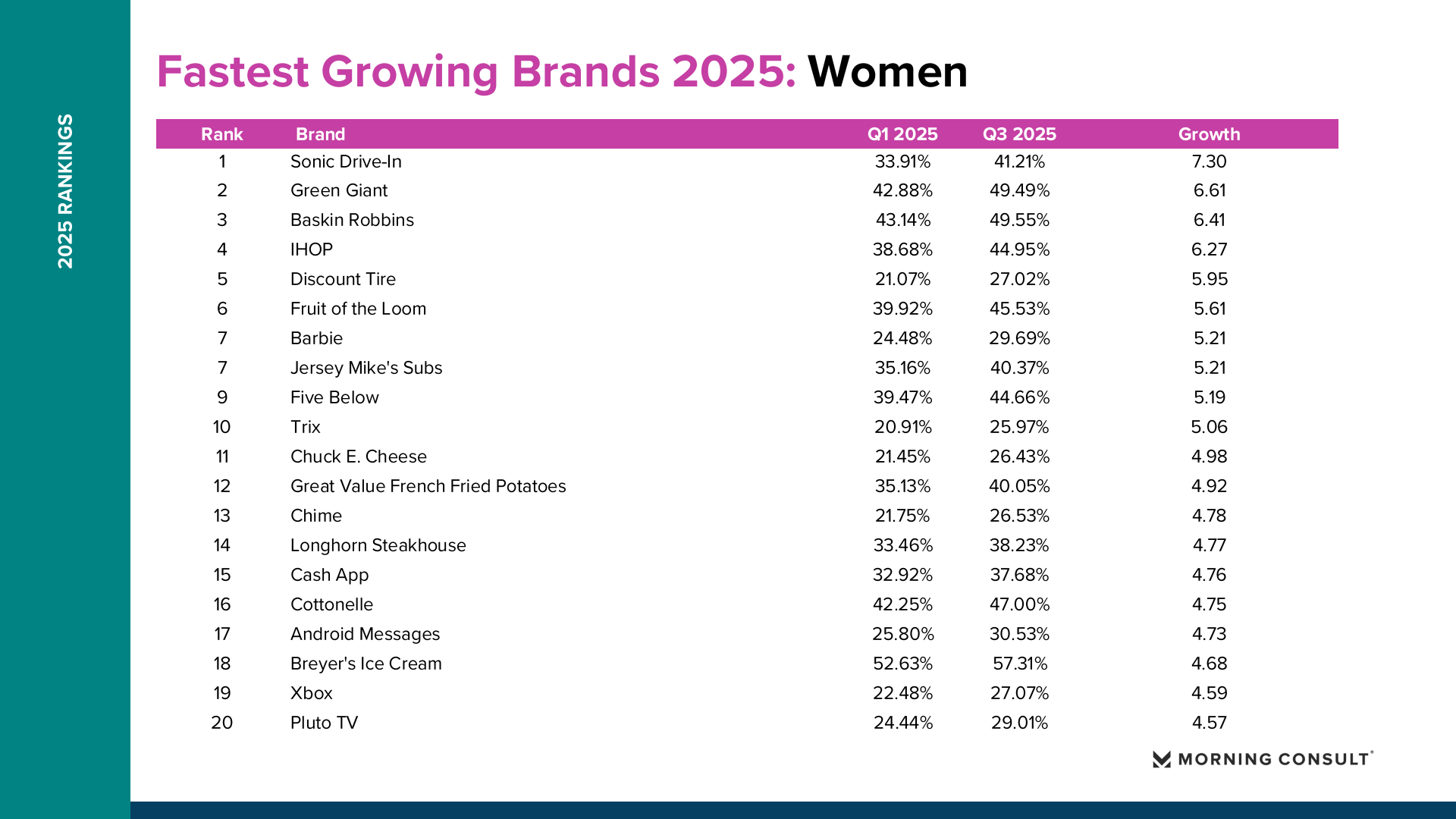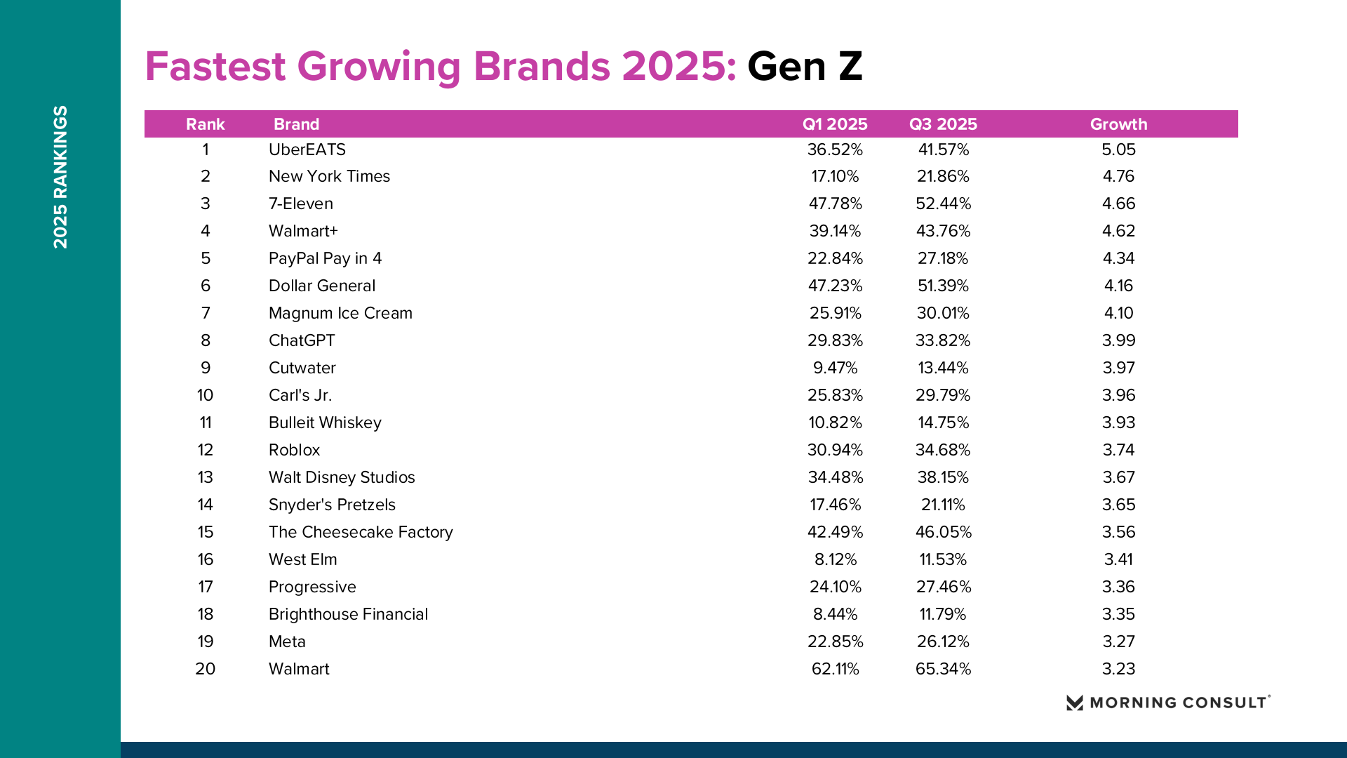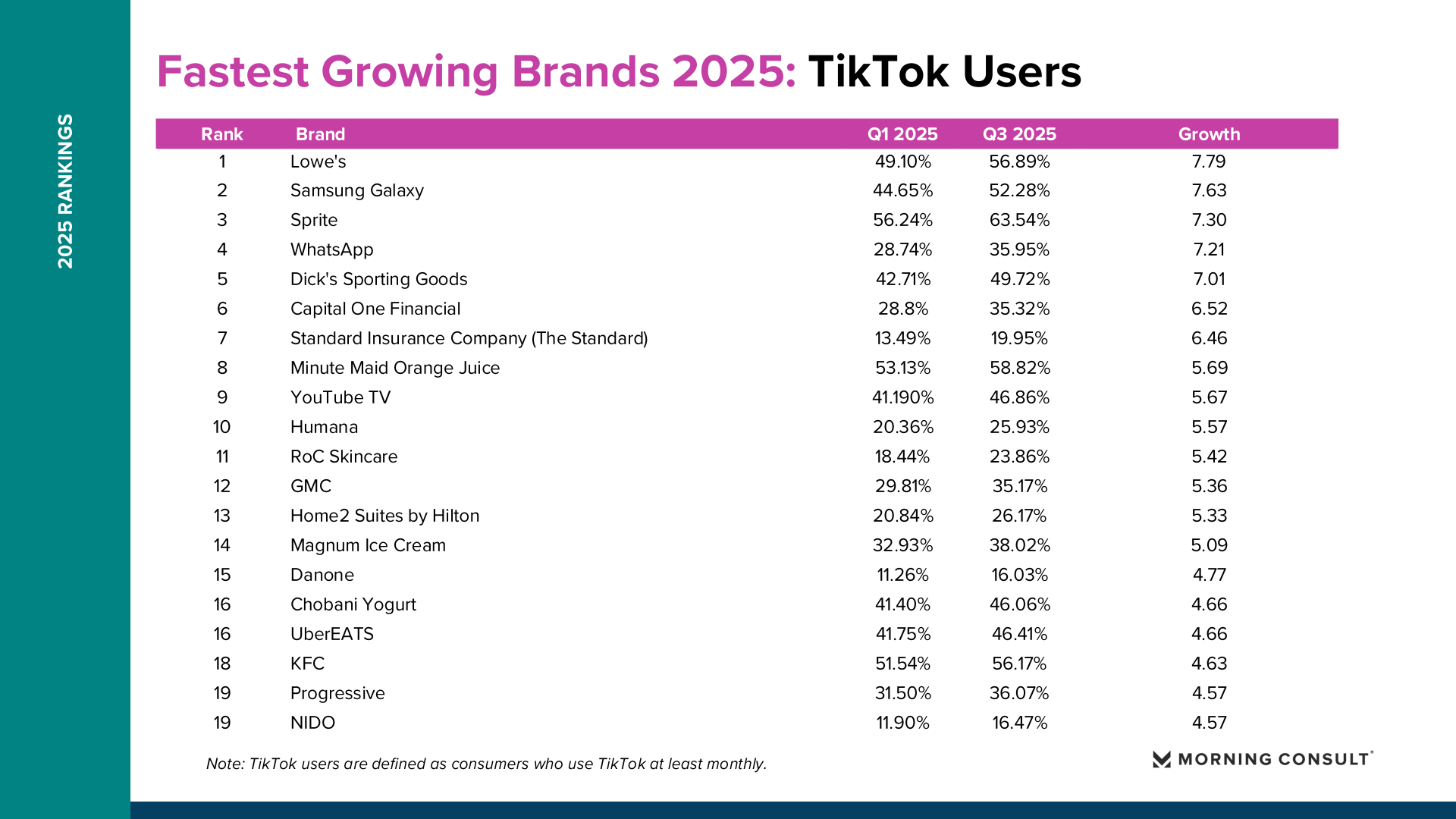 2025年美国品牌增长整体呈现“总量趋稳、结构分化”的特征。Morning Consult数据显示,纳入统计的品牌平均购买考虑度仅增长0.73个百分点,说明消费者整体品牌偏好变化有限,但部分品牌在特定消费趋势推动下实现显著突破。 在所有美国成年人样本中,DoorDash购买考虑度从2025年第一季度的36.18%提升至第三季度的42.57%,增长6.39个百分点,成为年度增长最快品牌。Fruit of the Loom从41.81%升至47.90%,增长6.09个百分点。TikTok Shop从21.62%提升至26.92%,增长5.30个百分点。Breyer’s Ice Cream购买考虑度达到54.79%,增长4.78个百分点。这些品牌的共同特点是高度贴近日常消费场景,并通过渠道创新或价格优势扩大用户基础。
