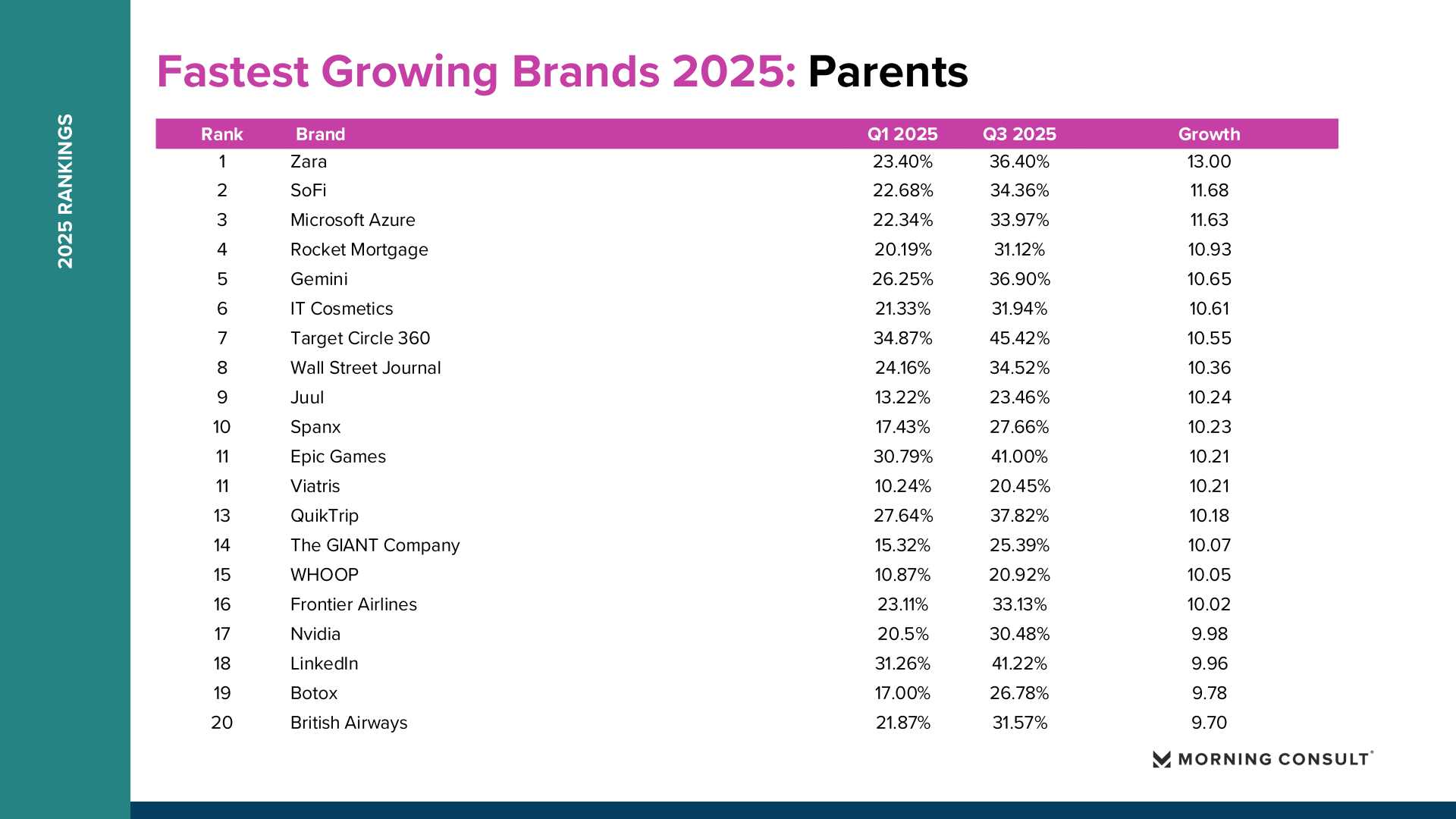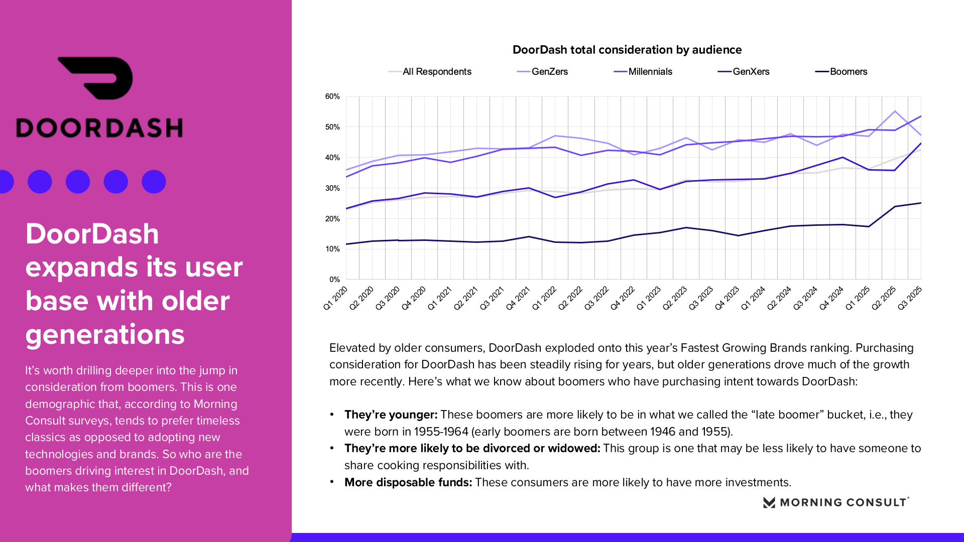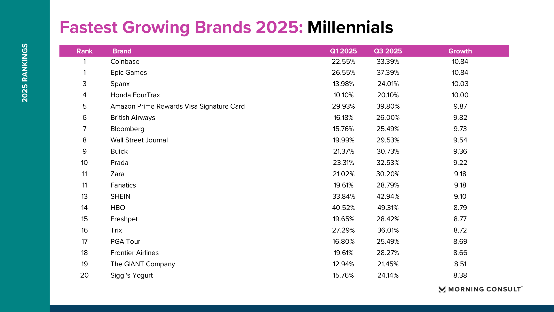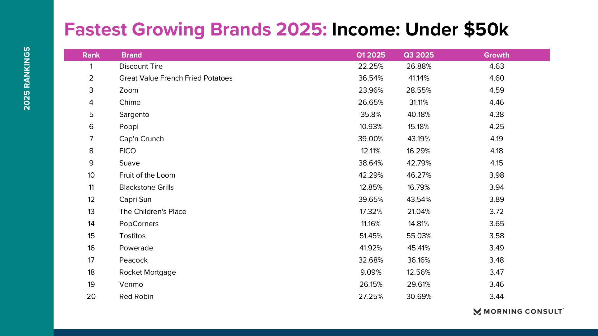 2025年美国品牌增长整体呈现“总量趋稳、结构分化”的特征。Morning Consult数据显示,纳入统计的品牌平均购买考虑度仅增长0.73个百分点,说明消费者整体品牌偏好变化有限,但部分品牌在特定消费趋势推动下实现显著突破。 在所有美国成年人样本中,DoorDash购买考虑度从2025年第一季度的36.18%提升至第三季度的42.57%,增长6.39个百分点,成为年度增长最快品牌。Fruit of the Loom从41.81%升至47.90%,增长6.09个百分点。TikTok Shop从21.62%提升至26.92%,增长5.30个百分点。Breyer’s Ice Cream购买考虑度达到54.79%,增长4.78个百分点。这些品牌的共同特点是高度贴近日常消费场景,并通过渠道创新或价格优势扩大用户基础。