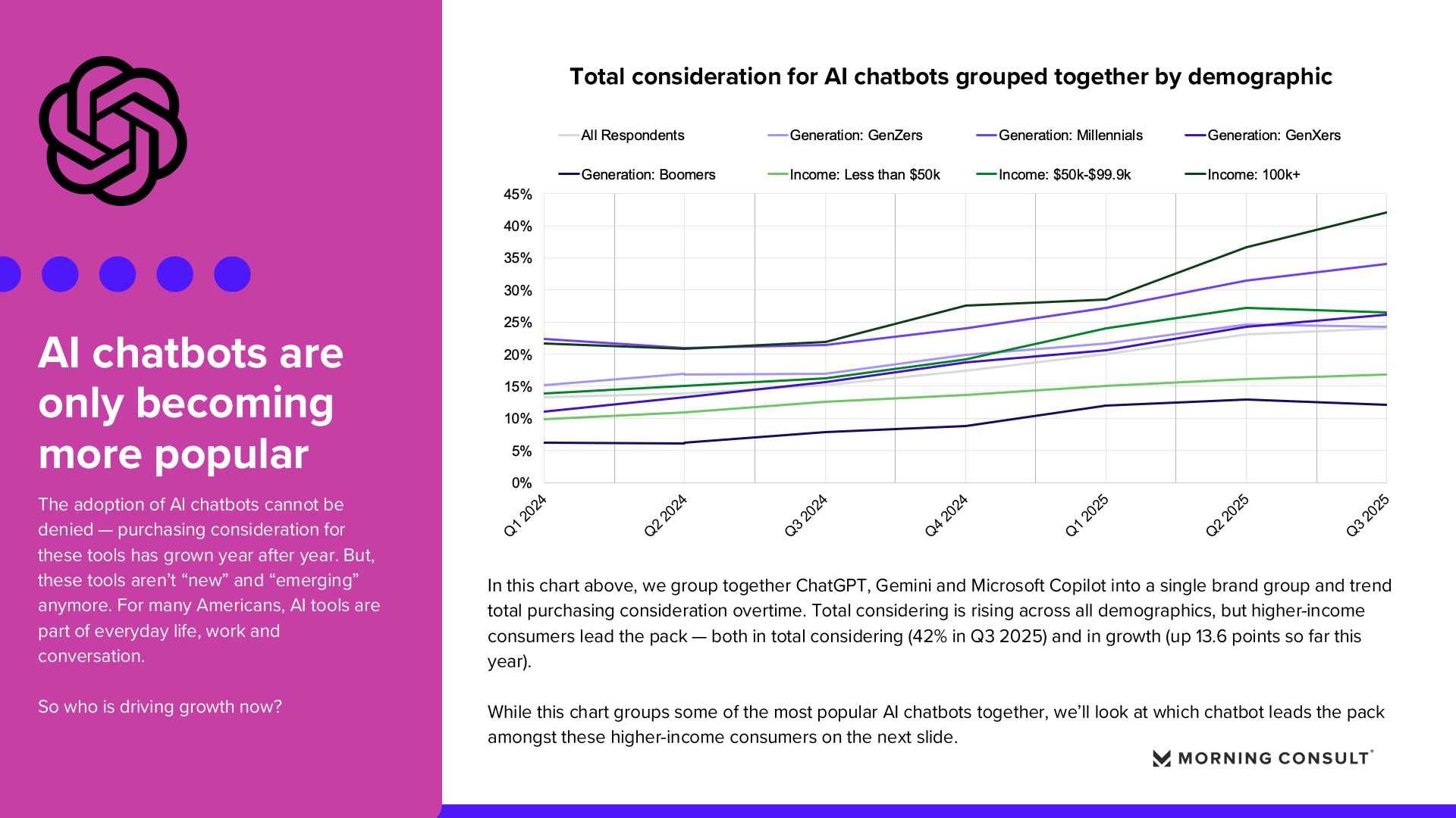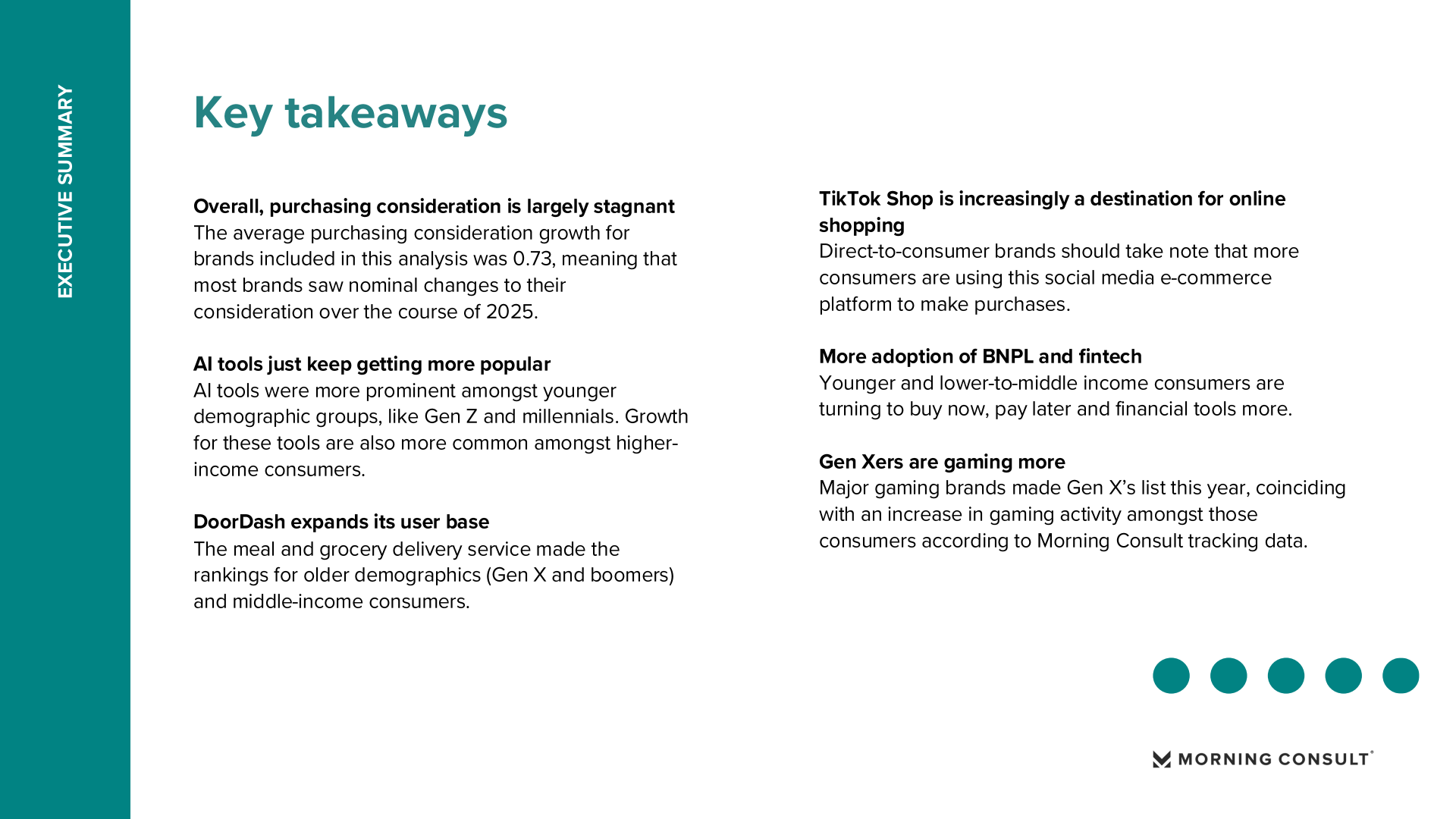 整体来看,2025年的品牌增长格局呈现三条清晰趋势。首先,AI工具正在迅速进入大众消费心智,并在高收入与知识型人群中形成率先普及。其次,社交媒体正从营销平台转变为交易入口,内容与购物的融合成为品牌增长的重要渠道。第三,不同年龄与收入群体之间的消费结构差异不断扩大,未来品牌增长将越来越依赖对细分人群的精准运营与场景化触达。