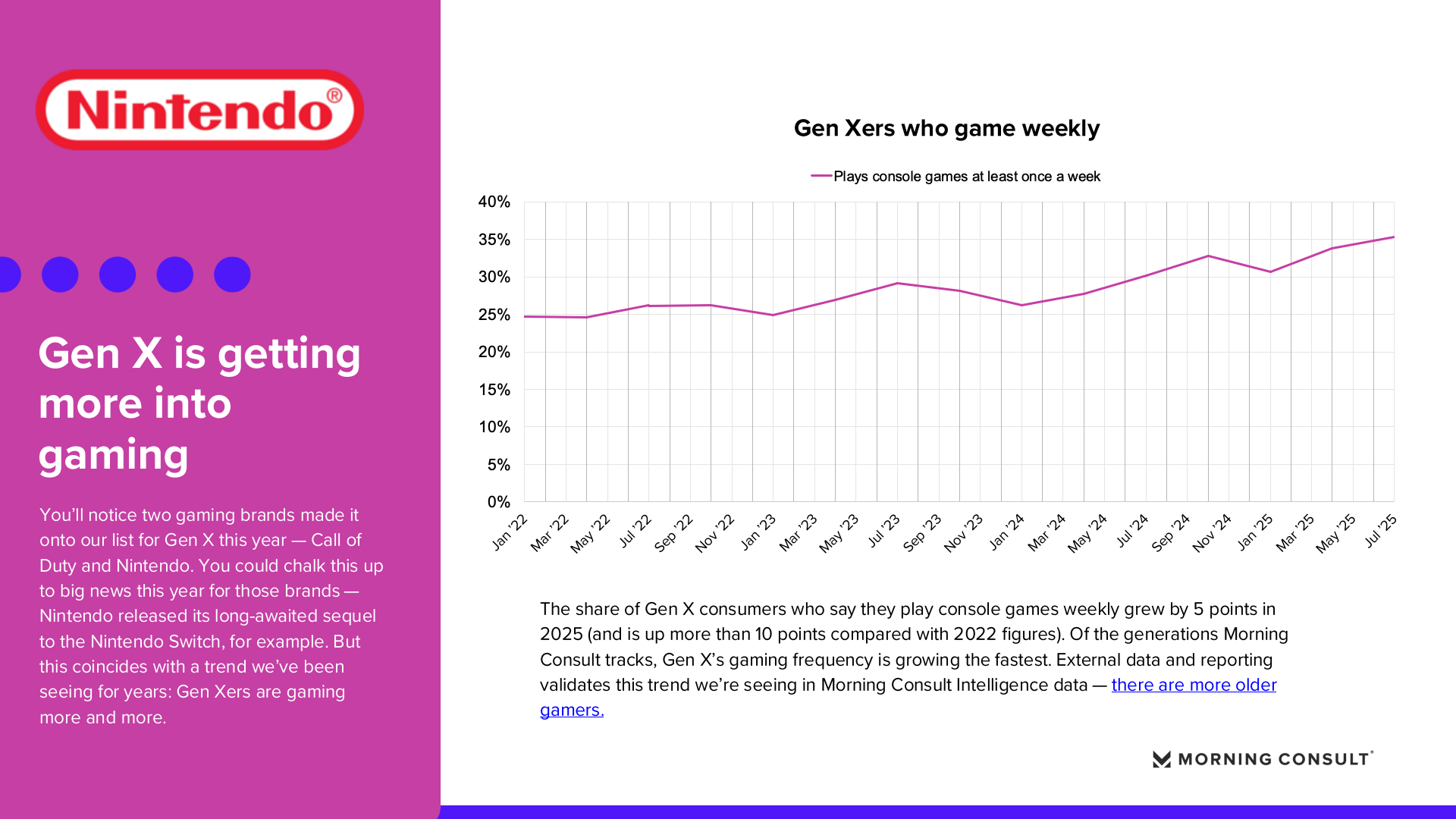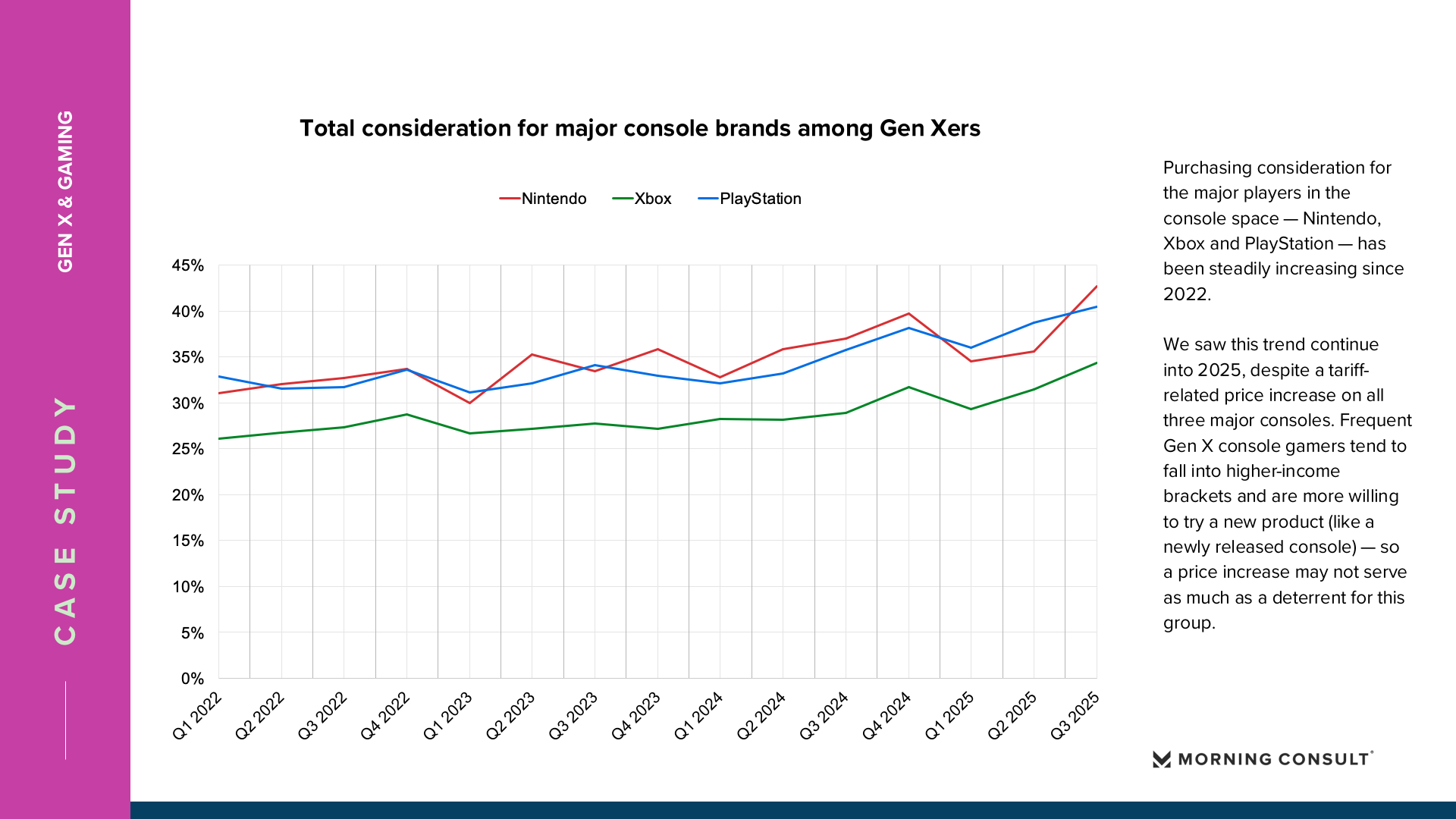 不同世代之间的消费兴趣分化也日益明显。Z世代增长最快品牌集中在外卖、便利零售与线上娱乐,例如UberEATS、7-Eleven和Roblox。千禧一代则更关注金融科技与数字服务,Coinbase购买考虑度增长10.84个百分点,同时Epic Games也增长10.84个百分点。X世代的娱乐消费出现新的变化,主机游戏参与度显著上升,每周进行主机游戏的比例在2025年上升5个百分点,相比2022年累计提升超过10个百分点。与此同时,婴儿潮一代仍偏好传统消费品牌,如Pringles、Downy和Breyer’s Ice Cream等日常消费品。