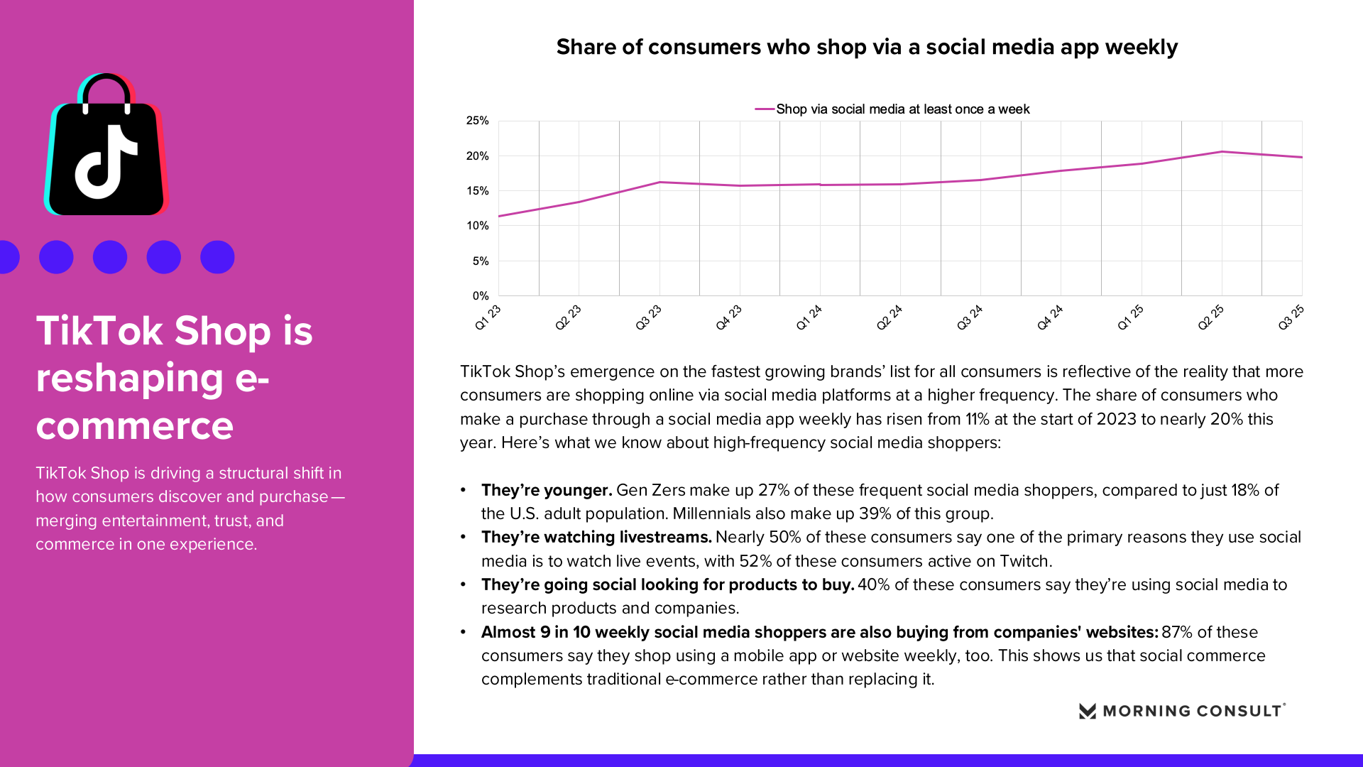 社交电商的崛起正在重塑消费发现与购买路径。数据显示,每周通过社交媒体进行购物的消费者比例,从2023年的11%上升至2025年的接近20%。在高频社交购物群体中,Z世代占比达到27%,明显高于其在美国成年人口中的18%占比,千禧一代占比则达到39%。同时,约40%的用户会通过社交媒体搜索产品和品牌信息。值得注意的是,87%的社交购物者仍然每周通过品牌官网或APP完成购物,这意味着社交平台并未替代传统电商,而是成为新的流量入口和消费决策场景。
