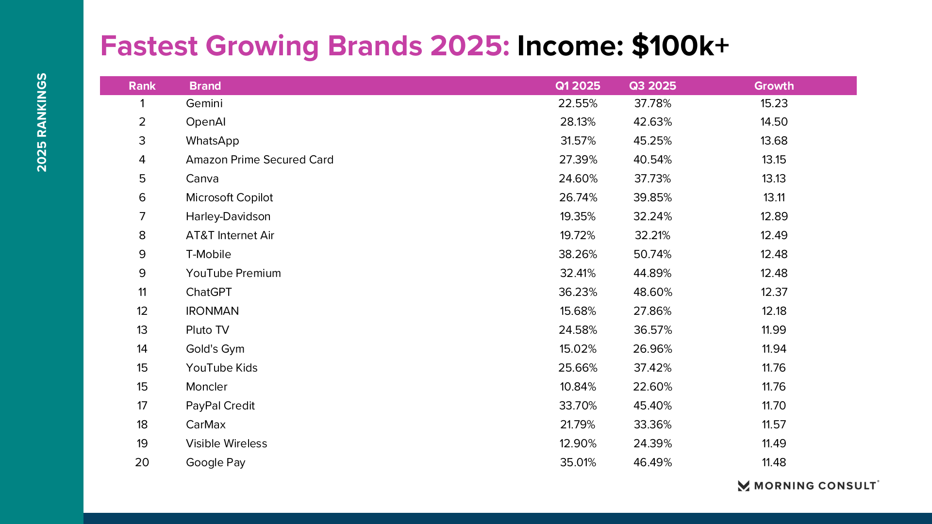 技术品牌尤其是AI工具成为另一条明显的增长主线。ChatGPT的购买考虑度从23.96%升至28.29%,增长4.33个百分点;Gemini从17.11%上升至21.68%,增长4.57个百分点。在年收入10万美元以上人群中,AI品牌增长更加明显:Gemini购买考虑度增长15.23个百分点,OpenAI品牌增长14.50个百分点。整体来看,高收入消费者对AI聊天工具的总体考虑度已经达到42%,年内增长13.6个百分点,显示AI产品正在快速从技术创新转变为主流生产力工具。