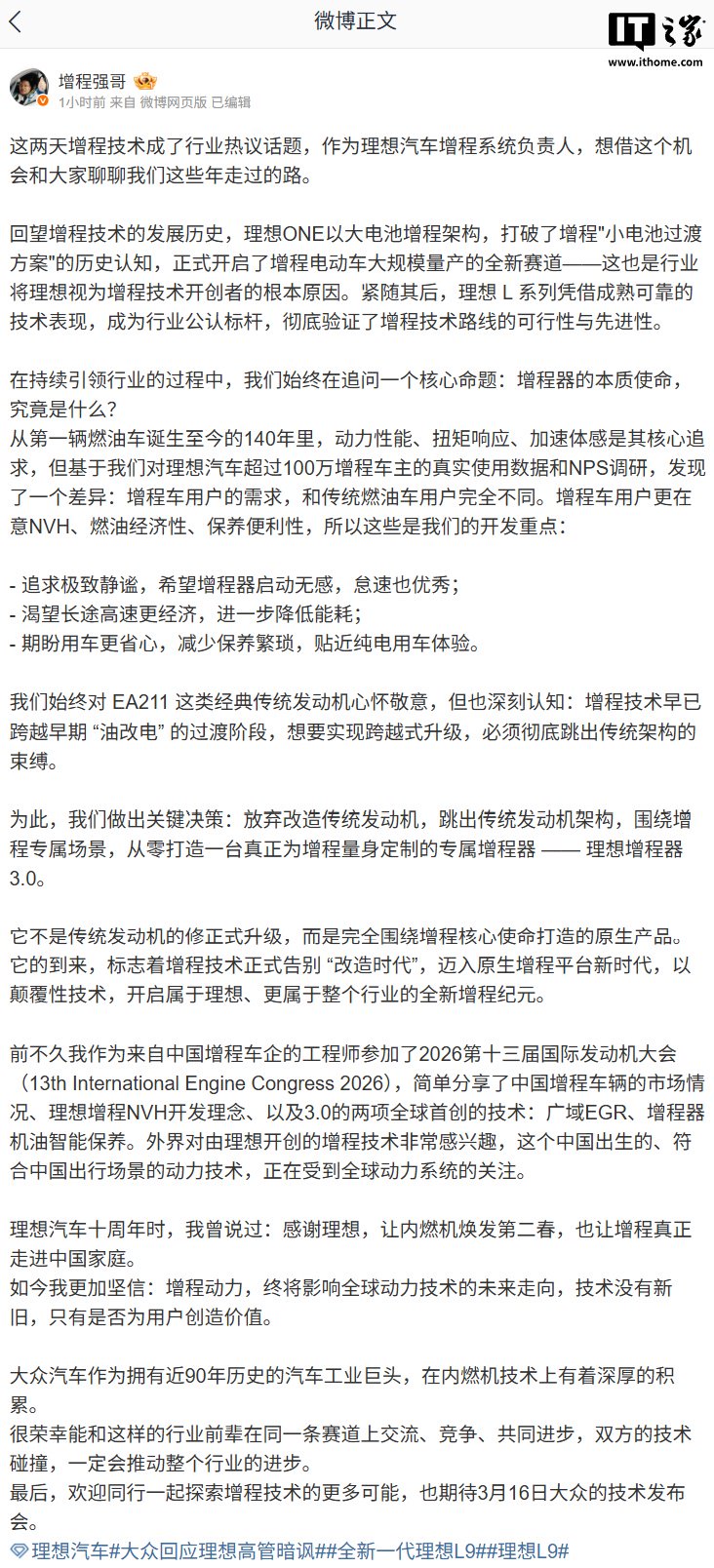 IT之家 3 月 6 日消息,上汽大众 3 月 2 日宣布其首台 EA211“黄金增程器”已正式下线,并将率先应用于 ID. ERA 9X 车型。今日,理想汽车增程系统负责人 @增程强哥 发文谈到了这款产品。