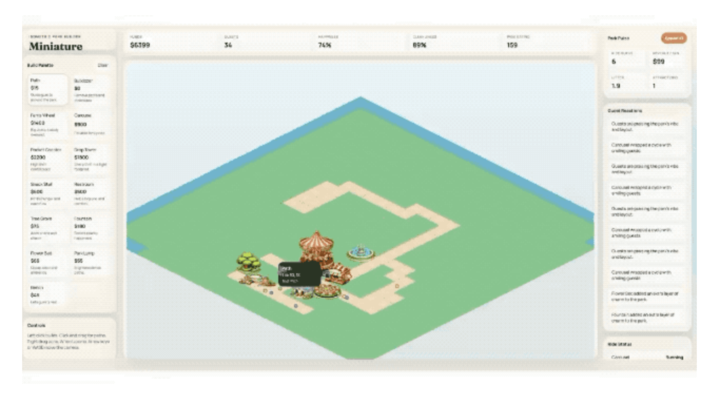 OpenAI 展示了一个典型案例:仅凭一条轻量提示词,GPT-5.4 生成了一个完整的等距视角主题公园模拟游戏,涵盖基于瓦片的路径铺设与景点建设系统、游客 AI 寻路与排队行为,以及资金、游客数、满意度、清洁度四项指标全部实时动态更新的综合评分。