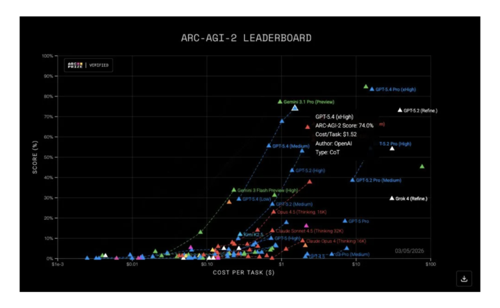 至于在视觉抽象推理基准 ARC-AGI-2 上,GPT-5.4 Pro 得分 83.3%,而上代 GPT-5.2 Pro 仅为 54.2%。