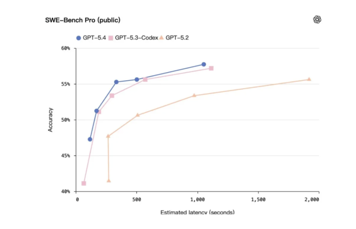 SWE-Bench Pro 专门测试真实软件工程任务,GPT-5.4 得分 57.7%,GPT-5.3-Codex 是 56.8%,GPT-5.2 是 55.6%。整合之后,编程分数不降反升,同时还顺带获得了计算机操控等一整套通用能力,几乎找不到明显的弱点。