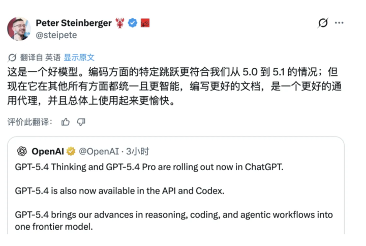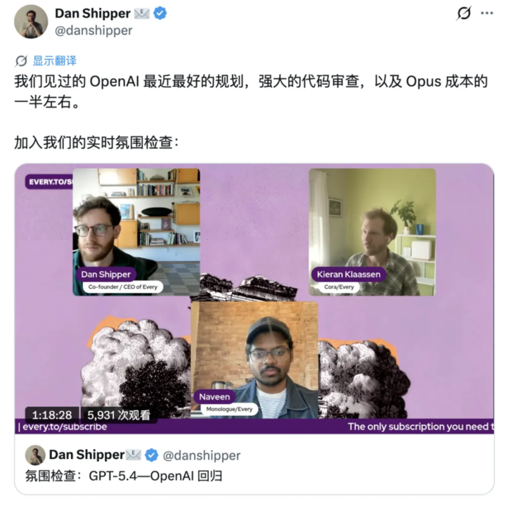 他点出了两个具体维度。其一,规划能力是长任务成败的关键,GPT-5.4 在任务拆解和持续推进上明显更有条理。其二,与 Claude Opus 相比约一半的成本,对需要大规模 API 调用的开发者来说,这个差距在账单上会非常直观。