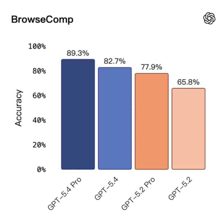 网页搜索方面,GPT-5.4 在 BrowseComp 基准上得分 82.7%,比 GPT-5.2 的 65.8% 高出 17 个百分点,Pro 版更达到 89.3%,创下业界最高分。Zapier CEO 评价说,GPT-5.4 会在其他模型放弃的地方继续搜索下去,是他们测试过持续性最强的模型。