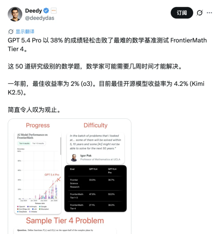 博主 Deedy 在推文中写道,从 2% 到 38%,「简直令人震惊」。Humanity’s Last Exam 有工具辅助时,GPT-5.4 Pro 得分 58.7%,GPT-5.2 Pro 是 50.0%,差距接近 9 个百分点。