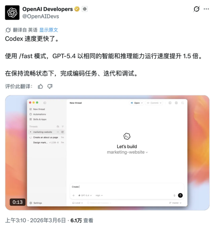 开启 Codex 中的 /fast 模式后,可使 GPT‑5.4 的 token 生成速度提升最高 1.5 倍,使得用户可以在编码、迭代和调试过程中保持流畅的工作状态。