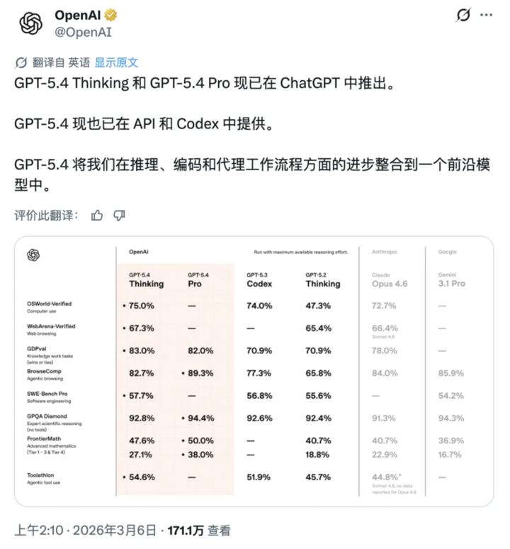 就在刚刚,OpenAI 正式发布 GPT-5.4,把编程、推理、计算机操控、网页搜索和百万 Token 上下文全部整合进同一个模型,且没有为了整合而牺牲任何一项的能力。