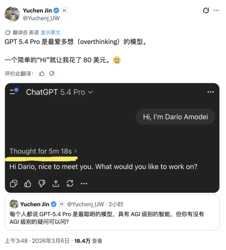 当然,强大的推理能力也有它的另一面。Hyperbolic 联合创始人金宇晨在 X 平台吐槽,GPT-5.4 Pro 是他用过最爱「过度思考」的模型——仅仅发了一句简单的「Hi」,模型就开始认真推理,直接烧掉了 80 美元。