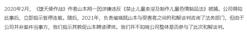显然,整篇声明都试图将责任限定在漫画家及相关编辑的个人层面,但这些说法无论如何都难以自洽。像是公告称曾明确指示《堕天战纪》停止连载,但却无法解释它为什么还是连载到了2022年;
