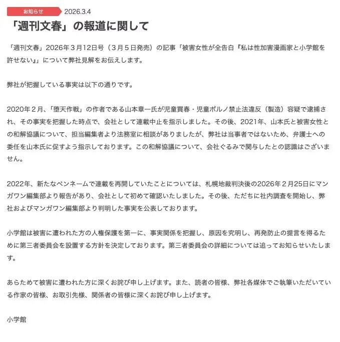 在这篇文章刊登的前夕,小学馆在即将到来的调查报道与舆论压力下,提前发布了名为“关于《周刊文春》报道一事”的公告。尽管公告对部分事实情况作出了一定程度的回应,但整体态度仍然可以用“嘴硬”来形容。