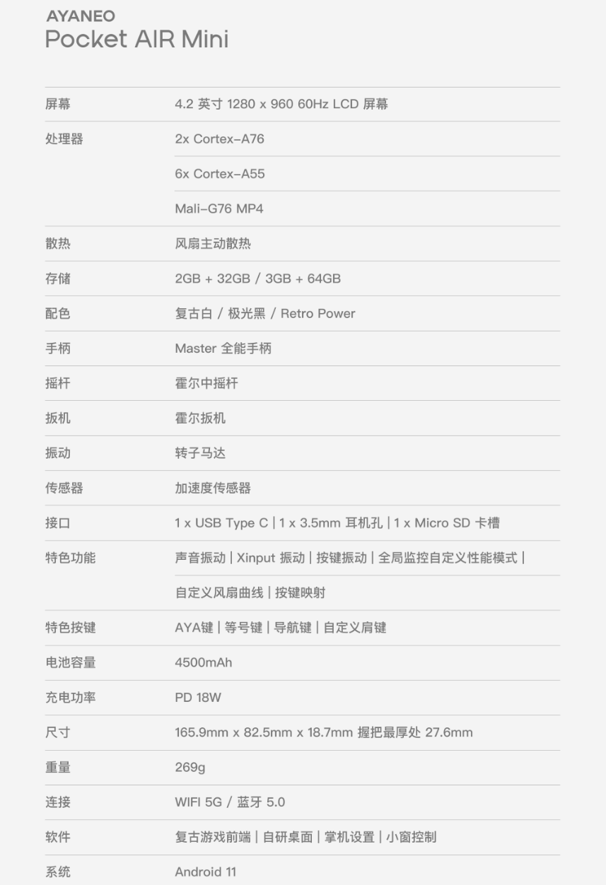 IT之家附 AYANEO Pocket AIR Mini 掌机参数如下: