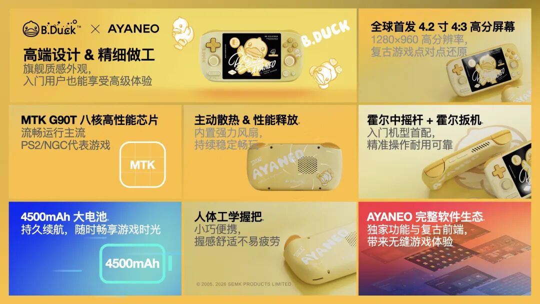 据介绍,AYANEO Pocket AIR Mini × B.Duck 联名限定款延续了小巧机身与人体工学设计,配备 4.2 英寸 4:3 比例屏幕,搭载联发科八核 G90T 芯片,并采用霍尔中摇杆与霍尔扳机。