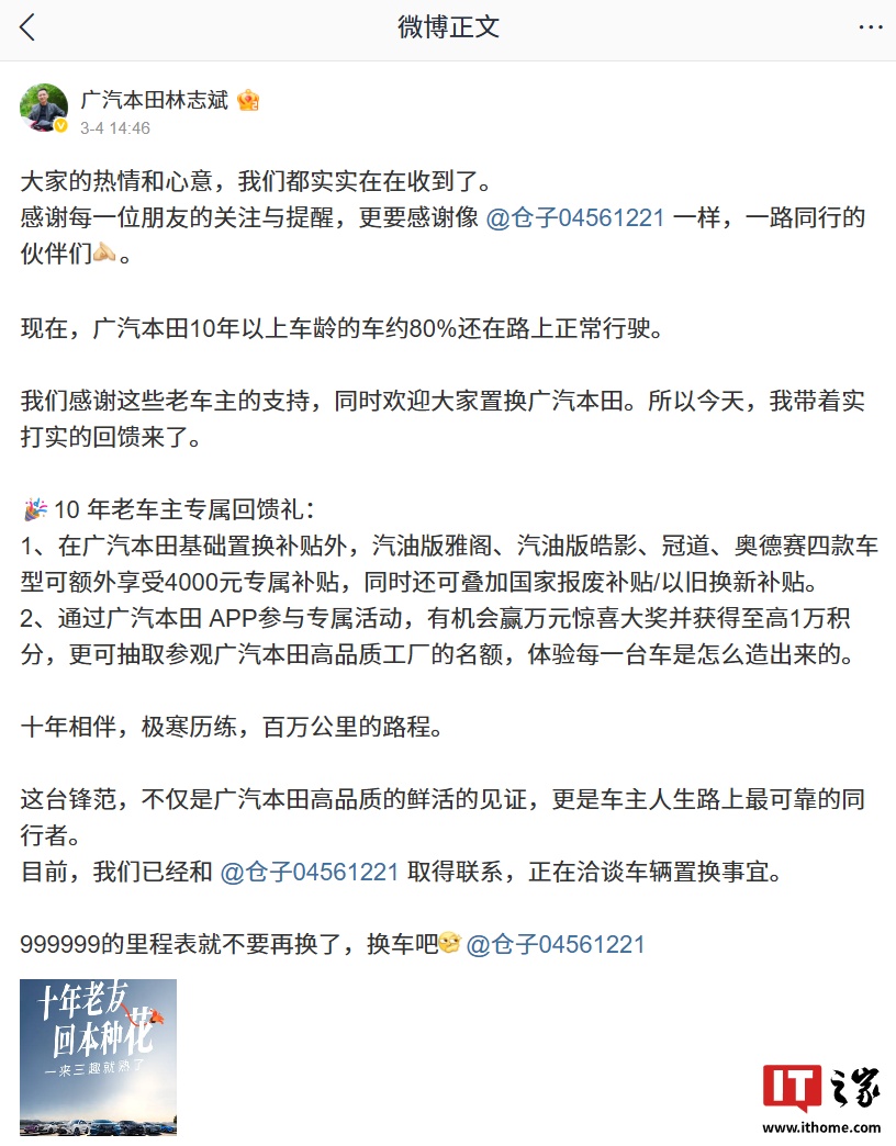 针对类似情况,林志斌表示广汽本田已推出 10 年老车主专属回馈活动:在广汽本田基础置换补贴外,汽油版雅阁、汽油版皓影、冠道、奥德赛四款车型可额外享受 4000 元专属补贴,同时可叠加国家报废补贴 / 以旧换新补贴。