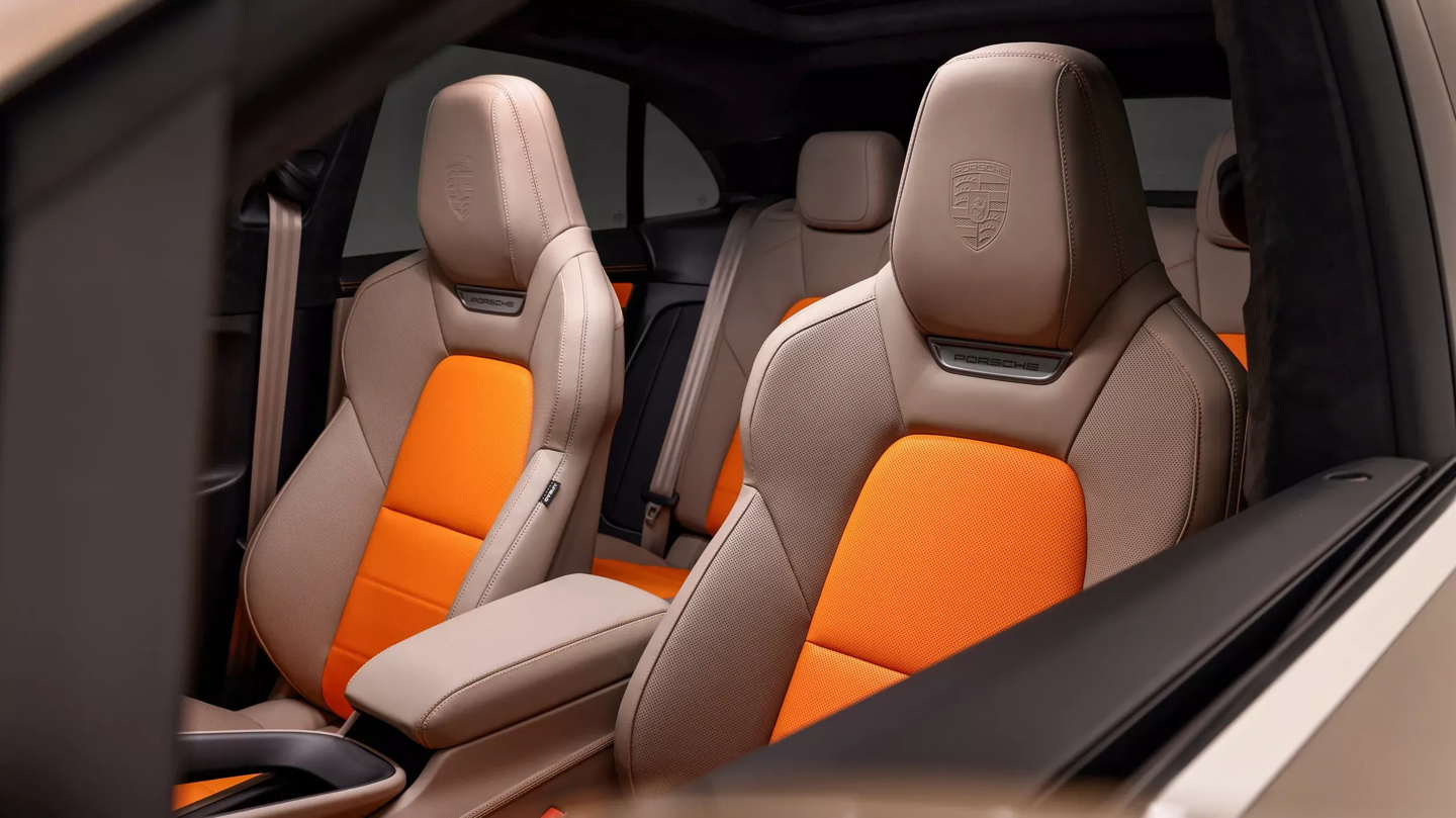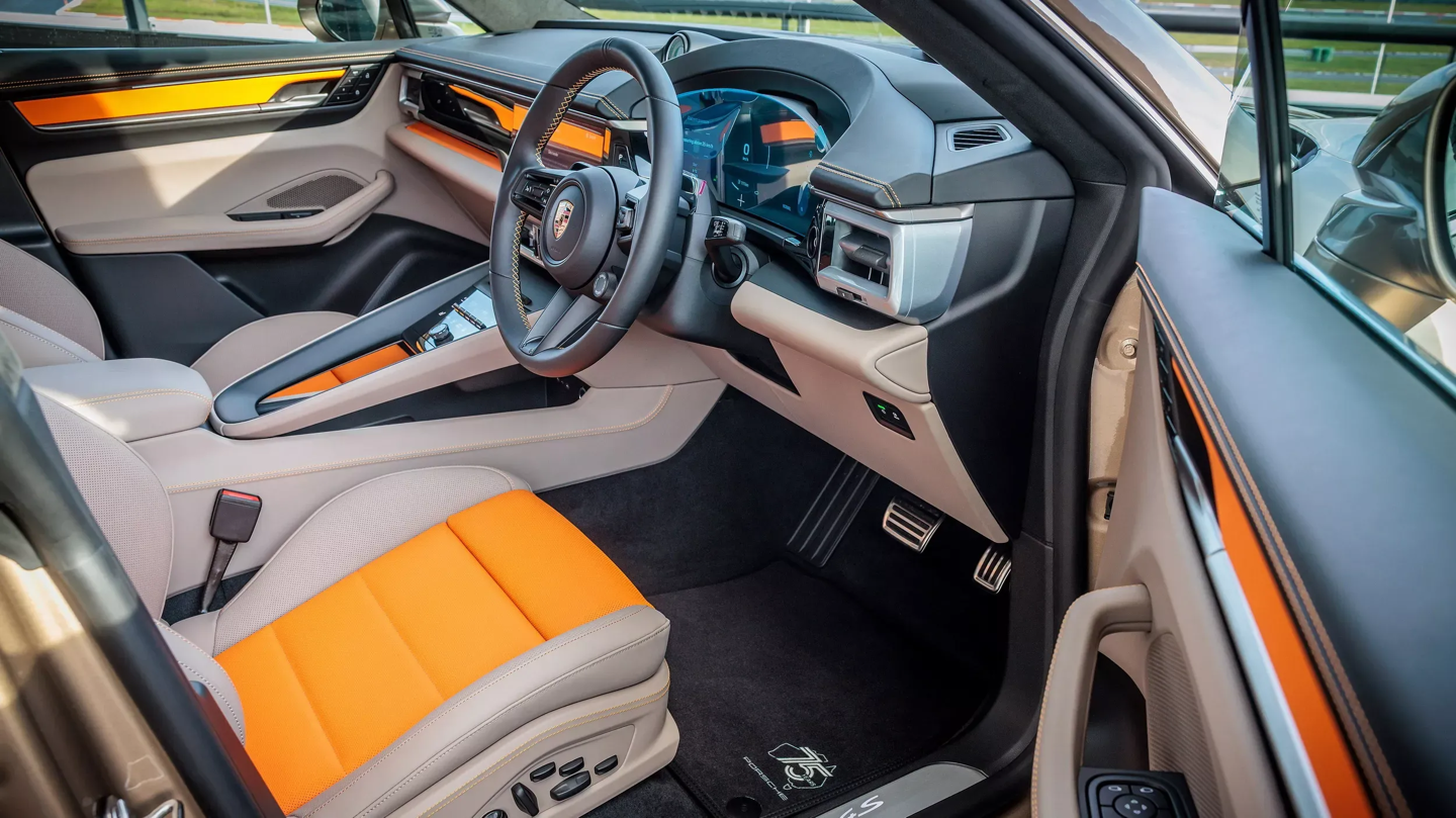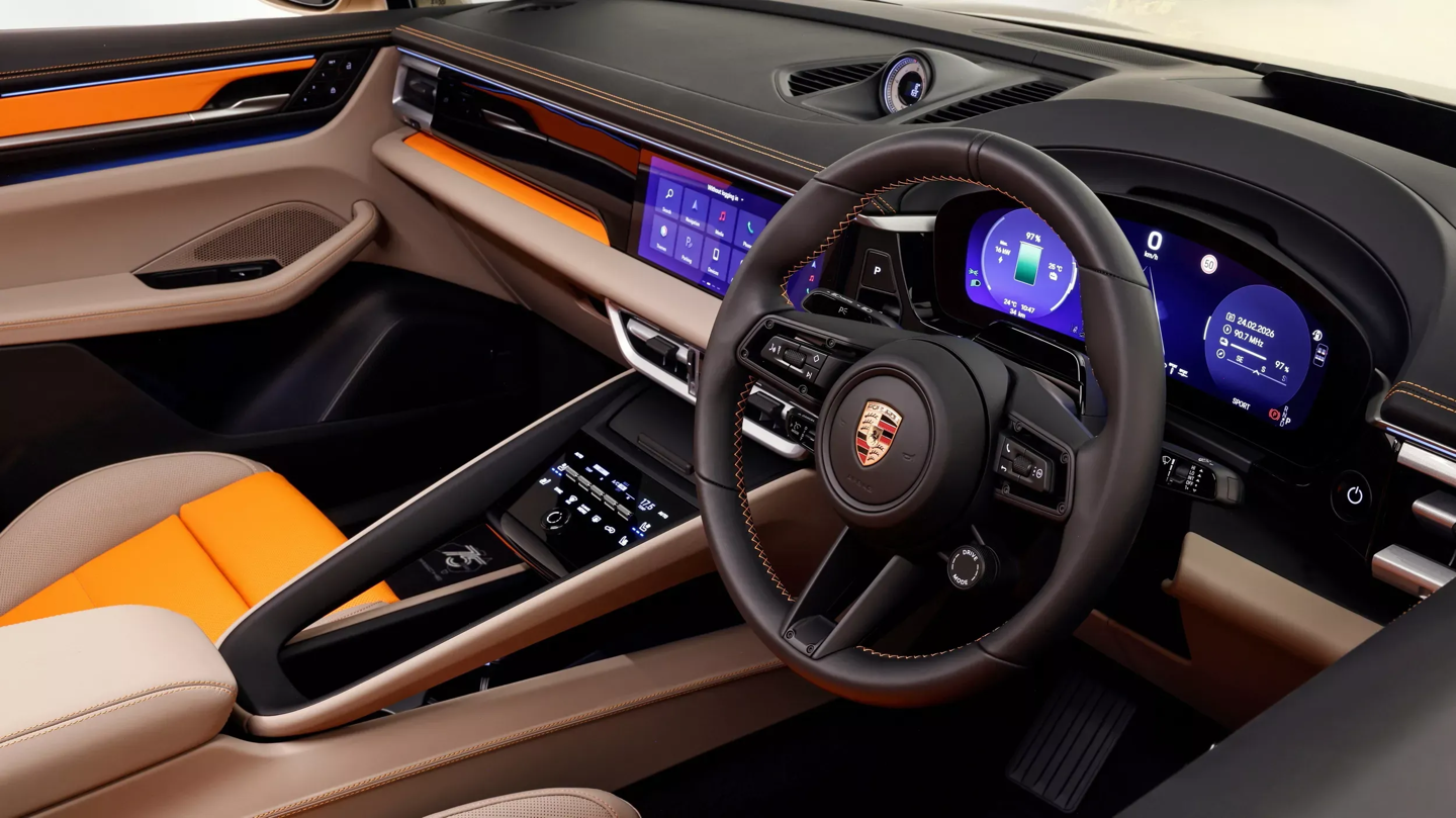 致敬南部海岸线的“向南”版交由纯电 Macan 4S 呈现,金古铜金属漆重现了大洋路的壮美悬崖,维苏威火山灰轮毂与越野挡板凸显出粗犷质感,座舱内点缀的橙色元素生动展现了南澳大利亚火山地貌的独特魅力。