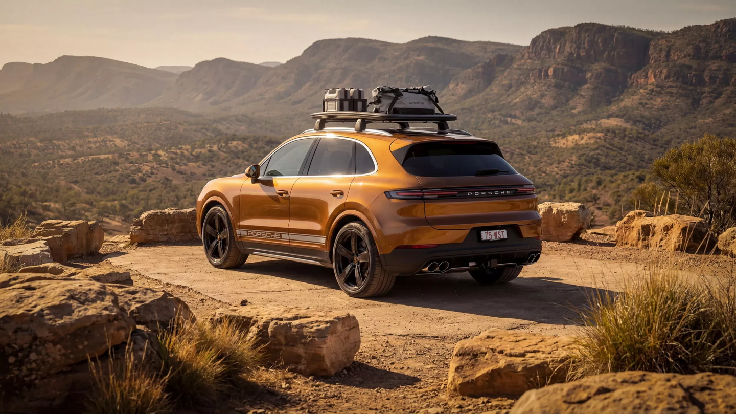 深入内陆的“向西”版主角是搭载 V8 引擎的 Cayenne S。为致敬拥有 44 亿年地质历史的西澳广袤腹地,新车身披依帕内玛棕金属漆,配备包含底盘装甲及仪表盘指南针在内的专业越野套件,车内的勃艮第红内饰嵌条则精准复刻了原住民岩石风貌。