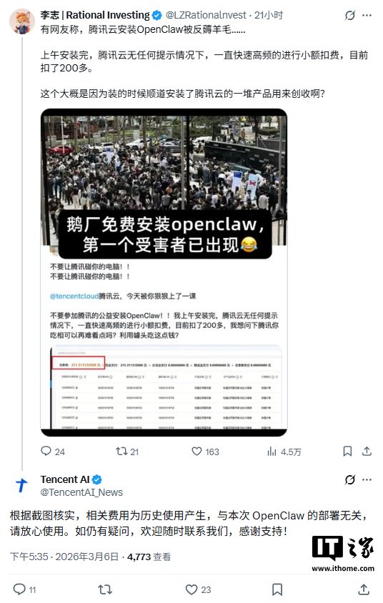 后续有网友在 X 上发帖称,自己在参与腾讯免费安装 OpenClaw 的活动后,在没有收到任何提示的情况下,账户被持续高频小额扣费,累计金额 211.311133 元,质疑腾讯“吃相难看”。