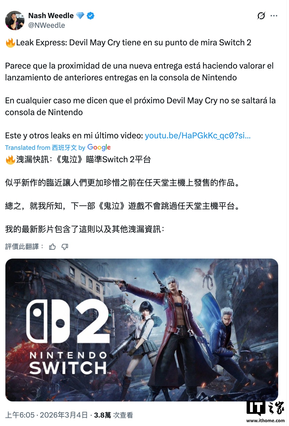 Nash Weedle 对此表示,《鬼泣》的下一部新作不会跳过任天堂平台,而是计划登陆 Switch 2,并且卡普空还在考虑把前两作补上。