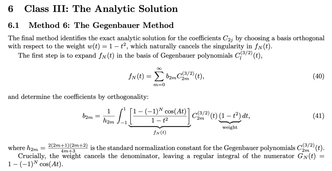 AI 发现了一个绝妙的思路:选择 Gegenbauer 多项式作为展开基底,而这类多项式的正交权函数恰好是 (1-t²),正好与被积函数分母中的奇异因子完全抵消!