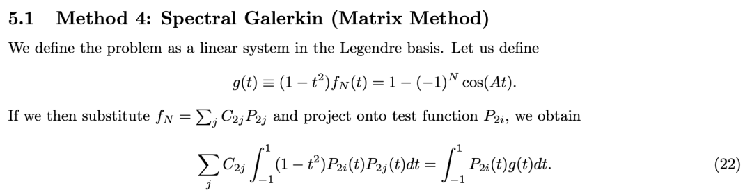 方法 4: 谱 Galerkin 矩阵法,把问题转化为一个三对角线性方程组来求解。