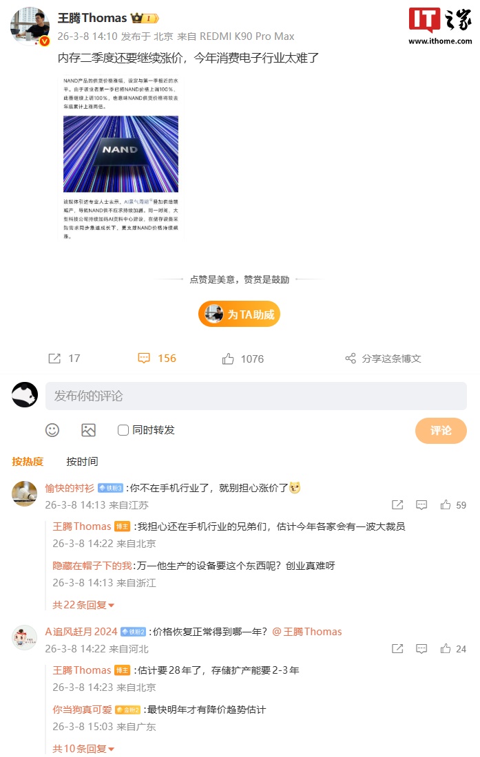 王腾表示,手机行业估计今年各家会有一波大裁员,而内存价格恢复正常估计得到 2028 年,存储扩产能要 2-3 年