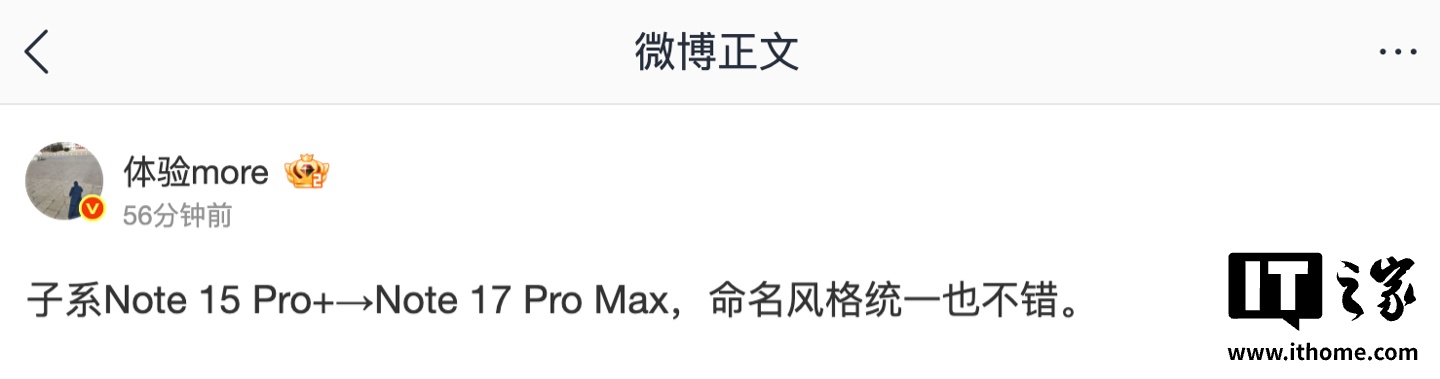 通过博主这番话语我们可以看出,这家厂商的子系机型或将统一命名风格,由 Note 15 Pro+ 变为 Note 17 Pro Max。