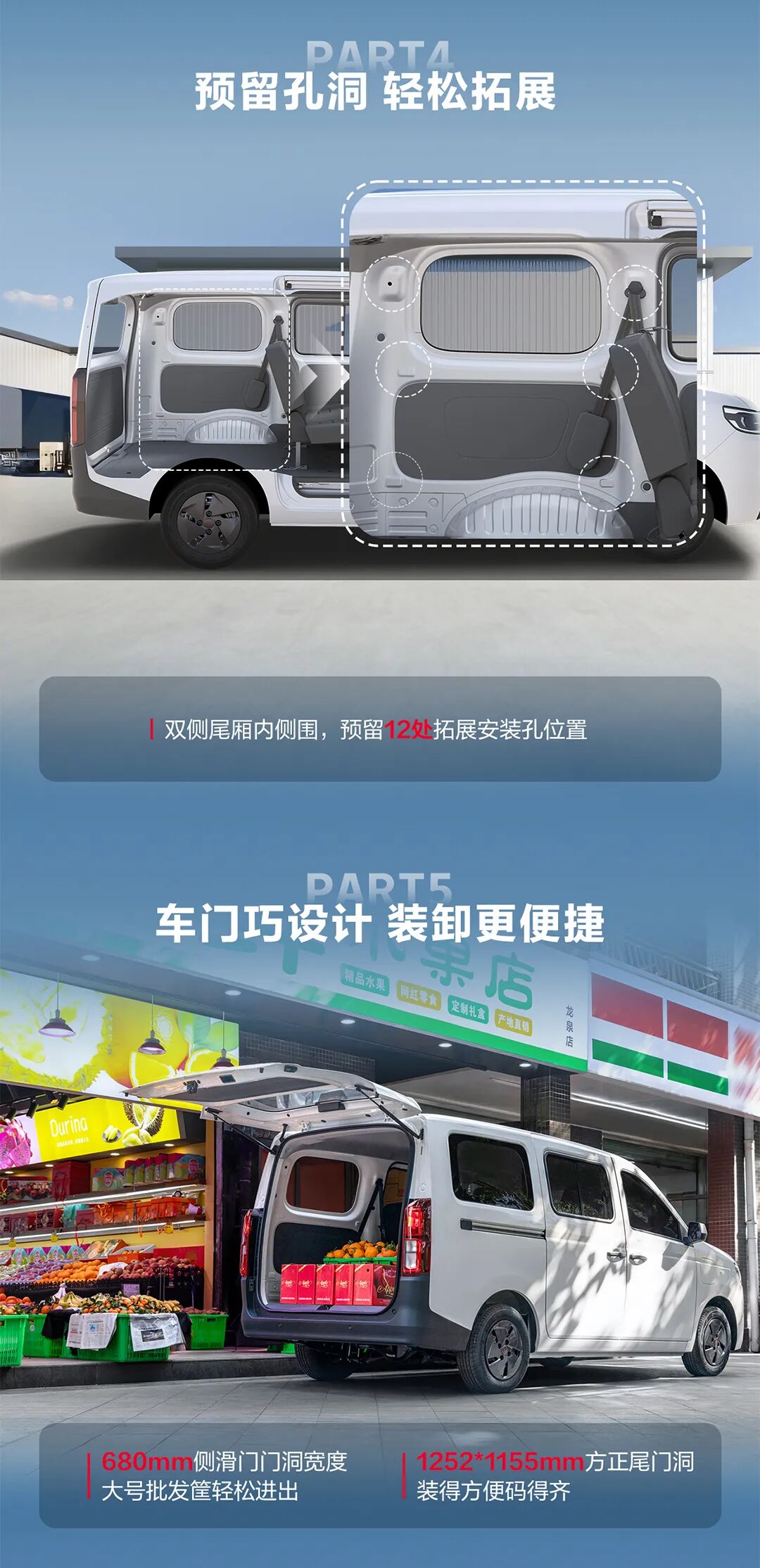 新车传承“大微客”开创者基因,整体提供 4.3m³ 的装载空间,配合 1252mm 宽度尾门以及 680mm 宽双侧滑门,无论是 14 个标准菠萝筐还是大件家电都能实现装卸。尾厢双侧围还预留了 12 处拓展安装孔。