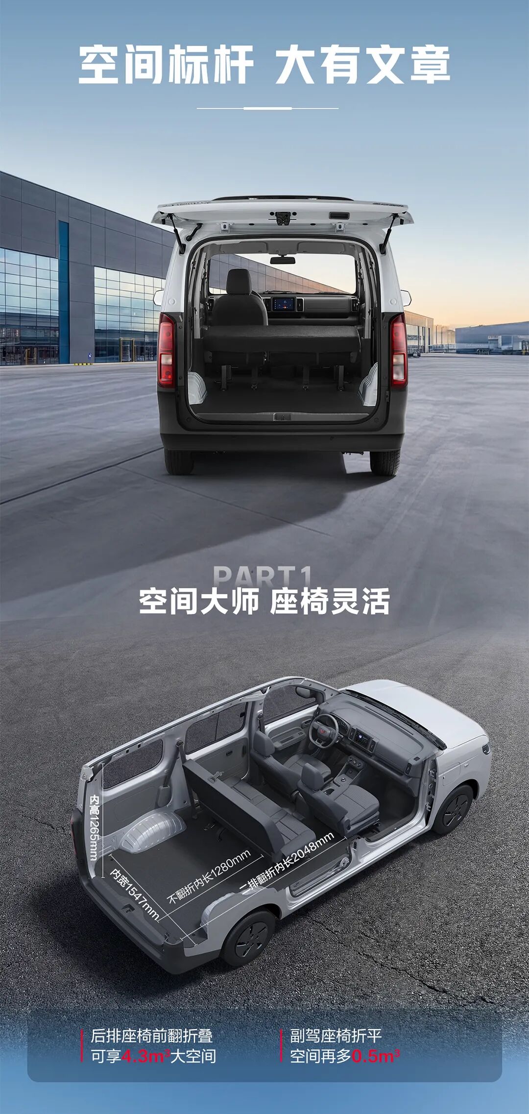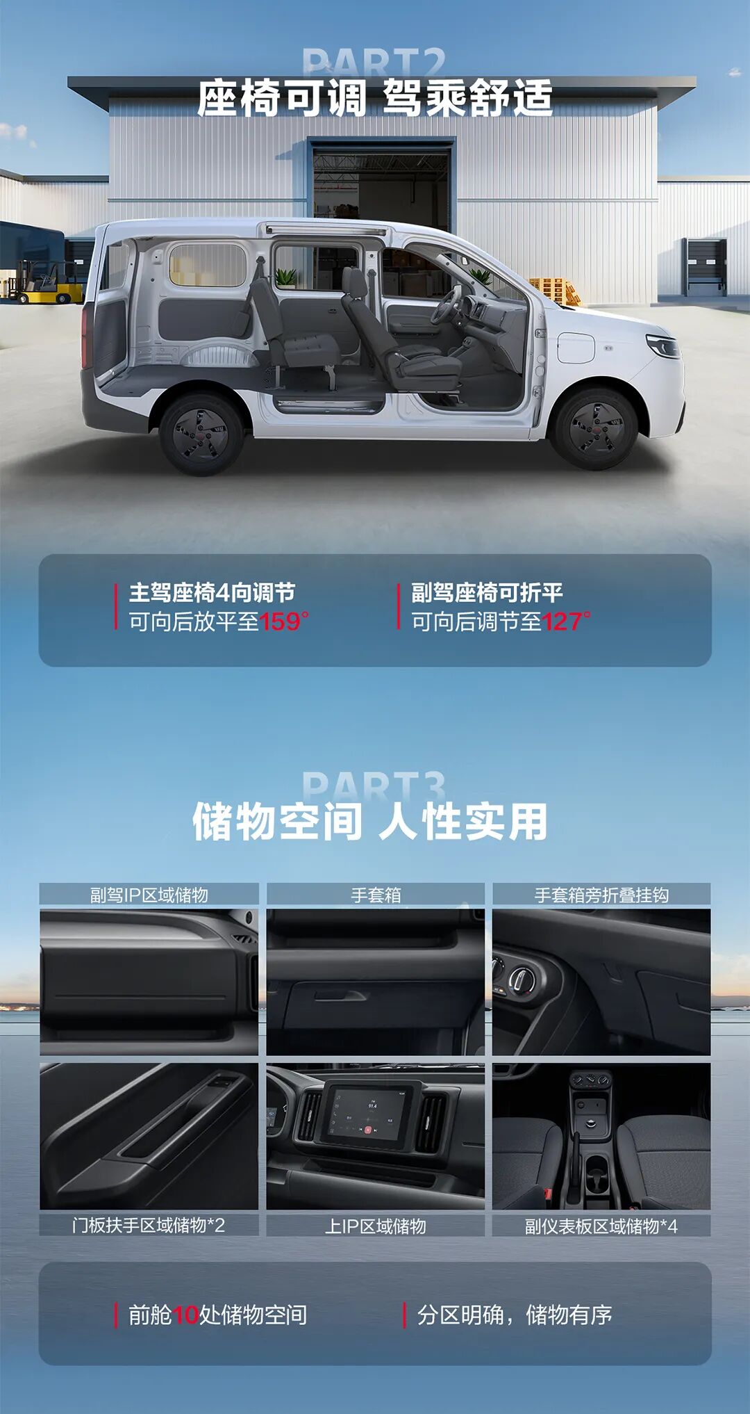 在座椅方面,新车还采用可完全折平的副驾驶座椅,折叠后可释放 0.5m³ 额外空间。主驾座椅同样支持放平,让司机在等候间隙能够躺倒休息。