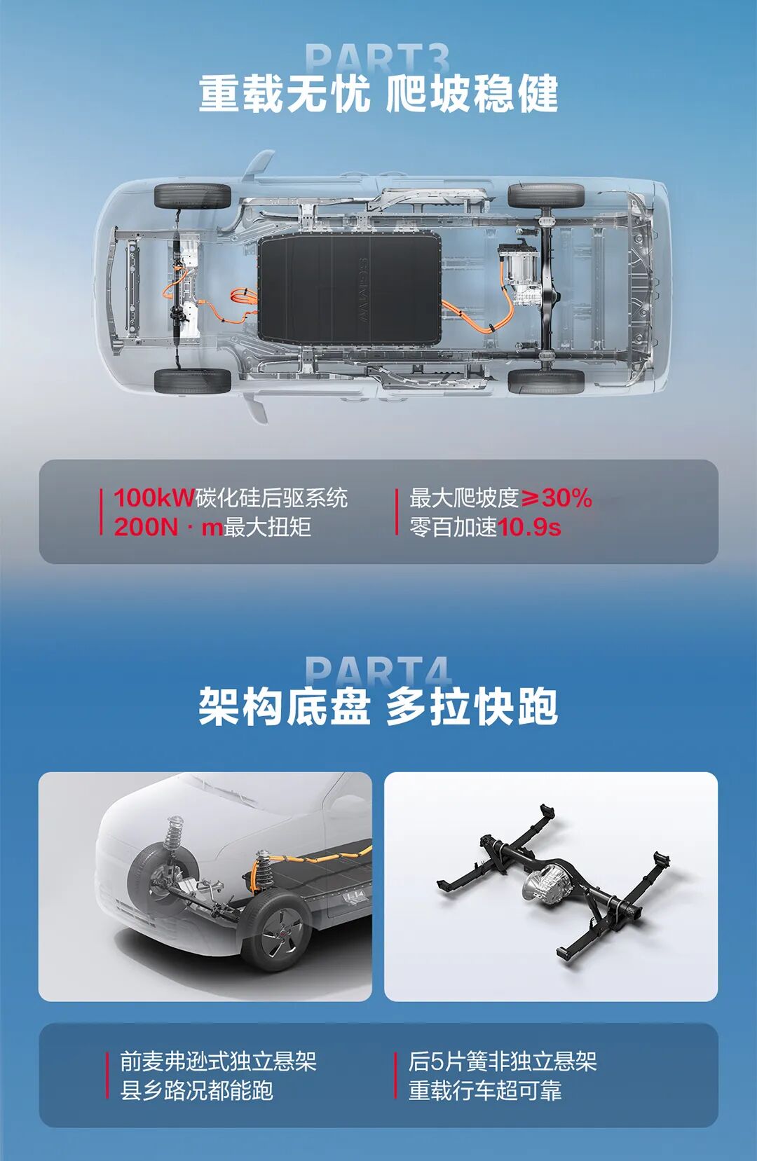 动力层面,新车搭载 100kW 碳化硅后驱系统,峰值扭矩达 200N·m,最高车速 135km/h,最大爬坡度≥30%。