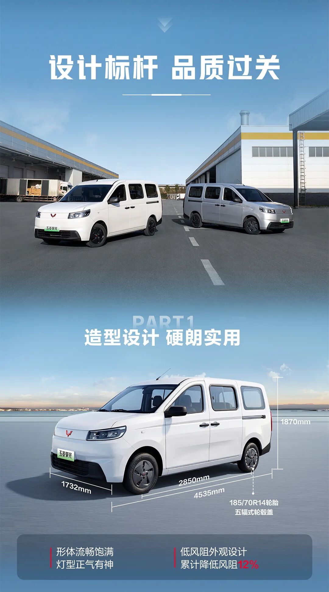 设计方面,五菱荣光纯电版通过 7 处风阻优化,实现了 0.304Cd 的风阻系数,累计降低风阻 12%。新车采用商用车首发的“以竹代塑”竹纤维复合材料内饰,能减少车内有害挥发物,提升用车体验。