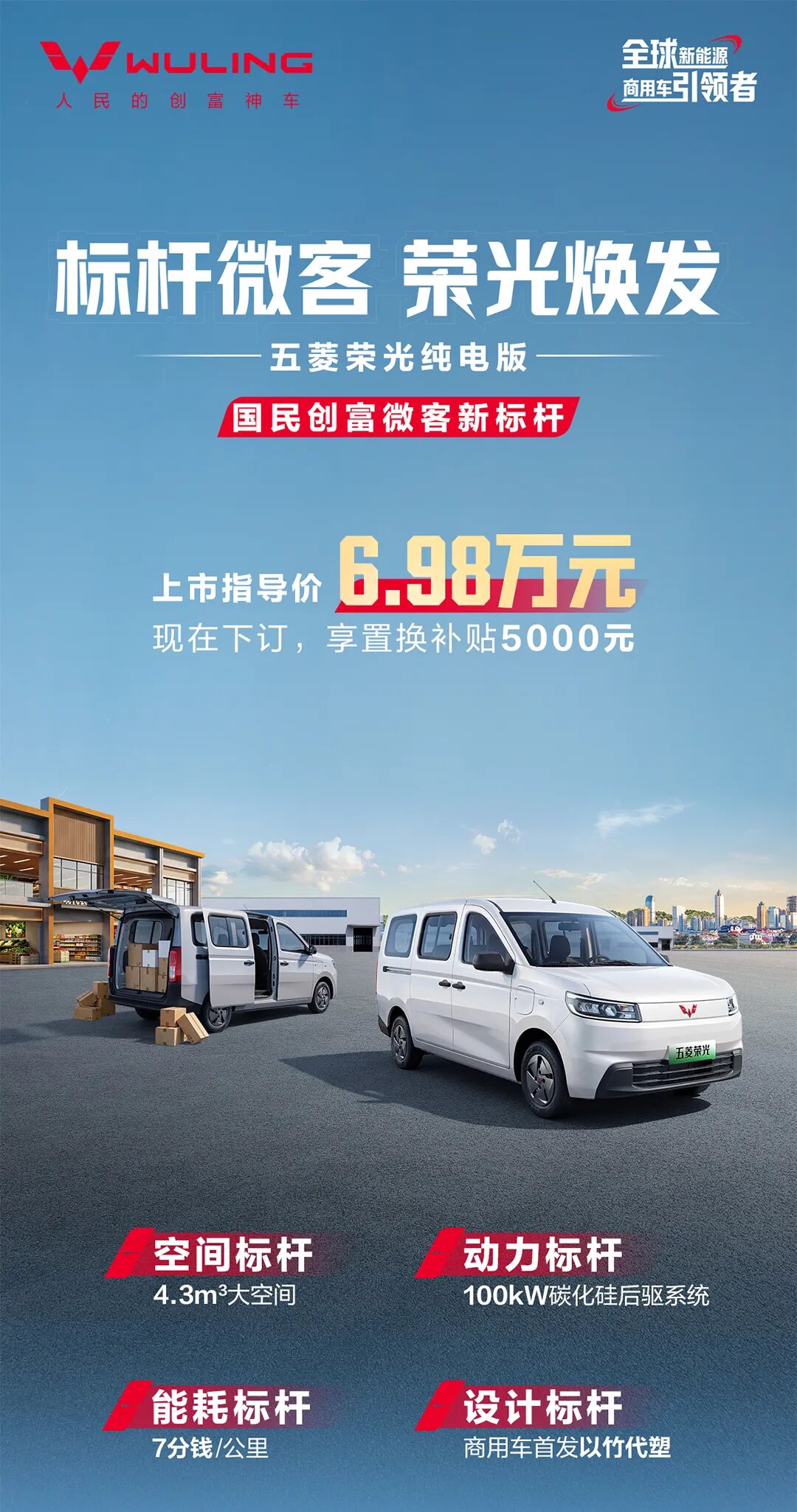 即日起,全国用户通过五菱汽车官方渠道下订五菱荣光纯电版,即可享受 5000 元的置换补贴。