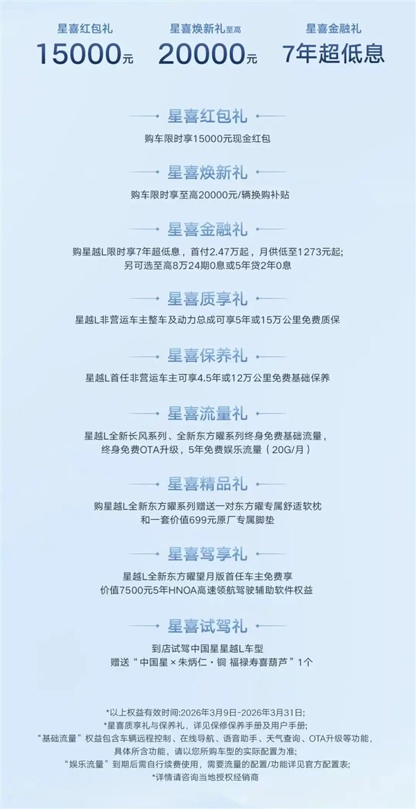 此外,购车可享7年超低息等多重福利,包括包括星喜红包礼、星喜焕新礼、星喜金融礼、星喜质享礼、星喜保养礼和星喜流量礼等。